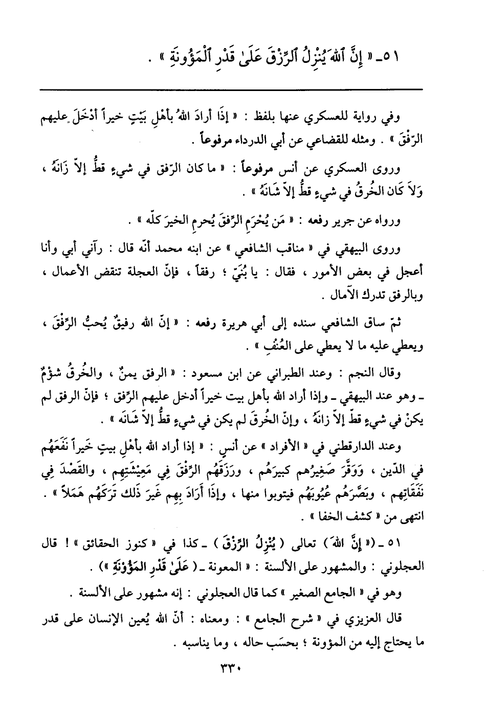 51- ( «إنّ الله) تعالى (ينزل الرّزق) - كذا في «كنوز الحقائق» ! قال العجلوني: والمشهور على الألسنة: «المعونة- (على قدر المؤونة» ) .