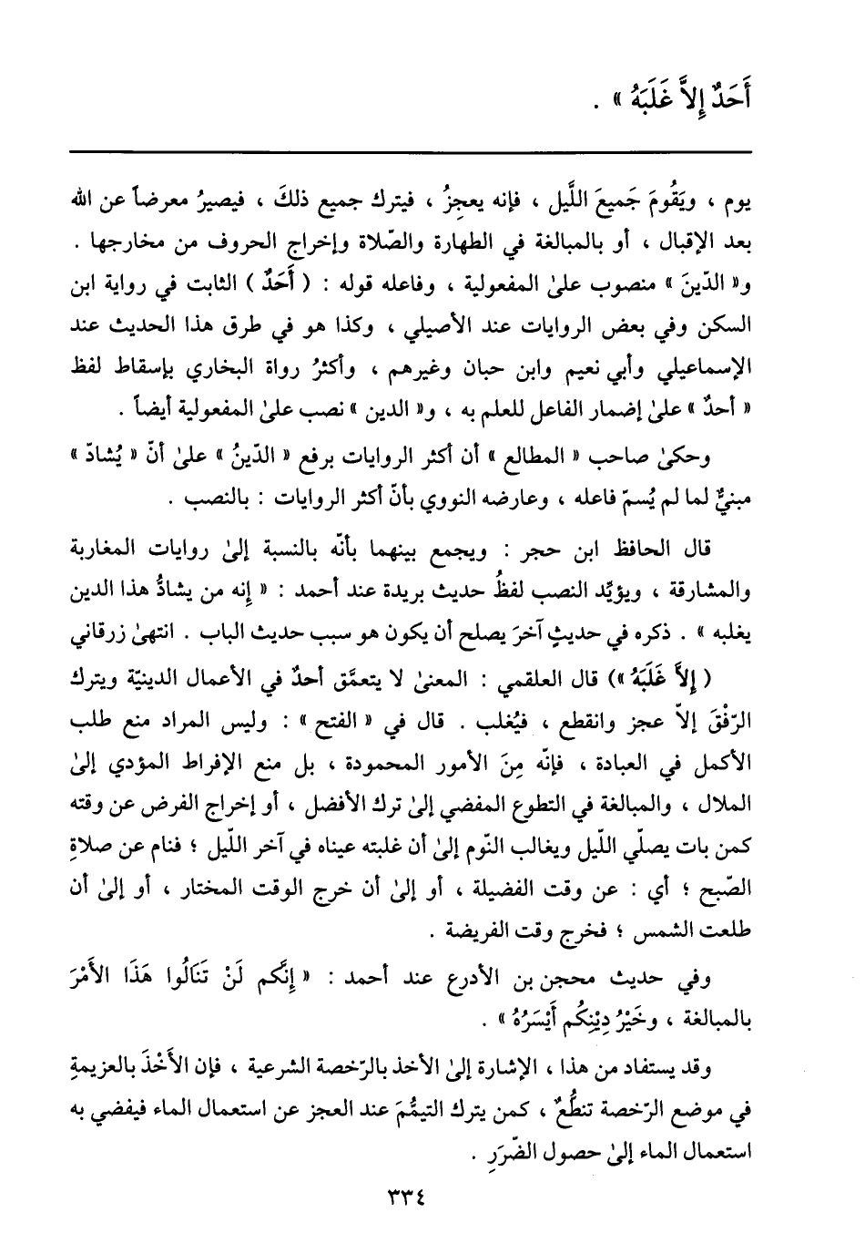 قال الحافظ ابن حجر: ويجمع بينهما بأنّه بالنسبة إلى روايات المغاربة والمشارقة، ويؤيّد النصب لفظ حديث بريدة عند أحمد: «إنه من يشادّ هذا الدين يغلبه» . ذكره في حديث آخر يصلح أن يكون هو سبب حديث الباب. انتهى زرقاني