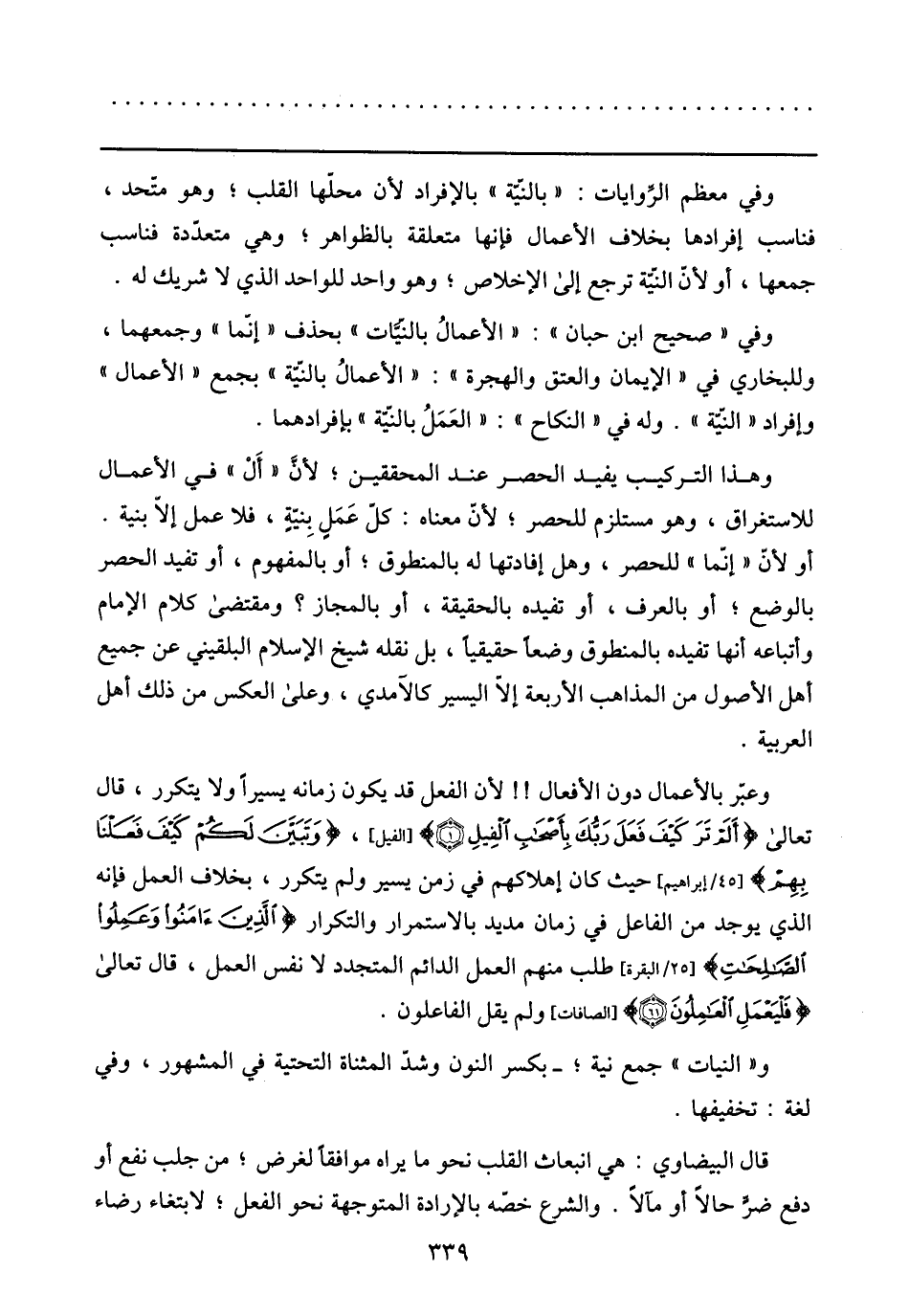 وهذا التركيب يفيد الحصر عند المحققين؛ لأنّ «أل» في الأعمال للاستغراق، وهو مستلزم للحصر؛ لأنّ معناه: كلّ عمل بنيّة، فلا عمل إلّا بنية.