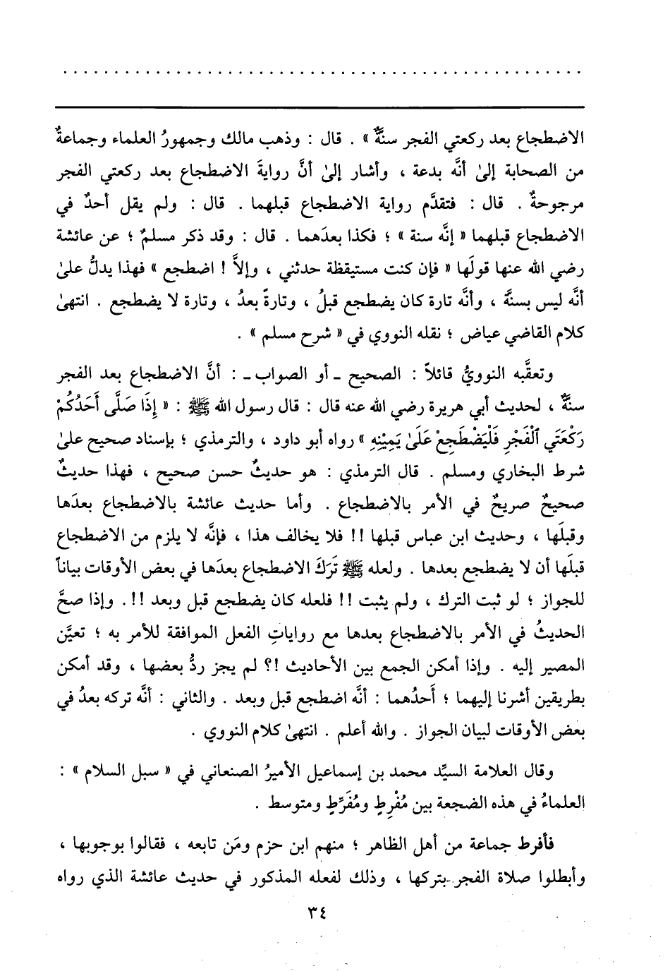وتعقّبه النوويّ قائلا: الصحيح- أو الصواب-: أنّ الاضطجاع بعد الفجر سنّة، لحديث أبي هريرة رضي الله عنه قال: قال رسول الله صلى الله عليه وسلّم: «إذا صلّى أحدكم ركعتي الفجر فليضطجع على يمينه» رواه أبو داود، والترمذي؛ بإسناد صحيح على شرط البخاري ومسلم. قال الترمذي: هو حديث حسن صحيح، فهذا حديث صحيح صريح في الأمر بالاضطجاع. وأما حديث عائشة بالاضطجاع بعدها وقبلها، وحديث ابن عباس قبلها!! فلا يخالف هذا، فإنّه لا يلزم من الاضطجاع قبلها ألايضطجع بعدها. ولعله صلى الله عليه وسلّم ترك الاضطجاع بعدها في بعض الأوقات بيانا للجواز؛ لو ثبت الترك، ولم يثبت!! فلعله كان يضطجع قبل وبعد!!. وإذا صحّ الحديث في الأمر بالاضطجاع بعدها مع روايات الفعل الموافقة للأمر به؛ تعيّن المصير إليه. وإذا أمكن الجمع بين الأحاديث!؟ لم يجز ردّ بعضها، وقد أمكن بطريقين أشرنا إليهما؛ أحدهما: أنّه اضطجع قبل وبعد. والثاني: أنّه تركه بعد في بعض الأوقات لبيان الجواز. والله أعلم. انتهى كلام النووي.