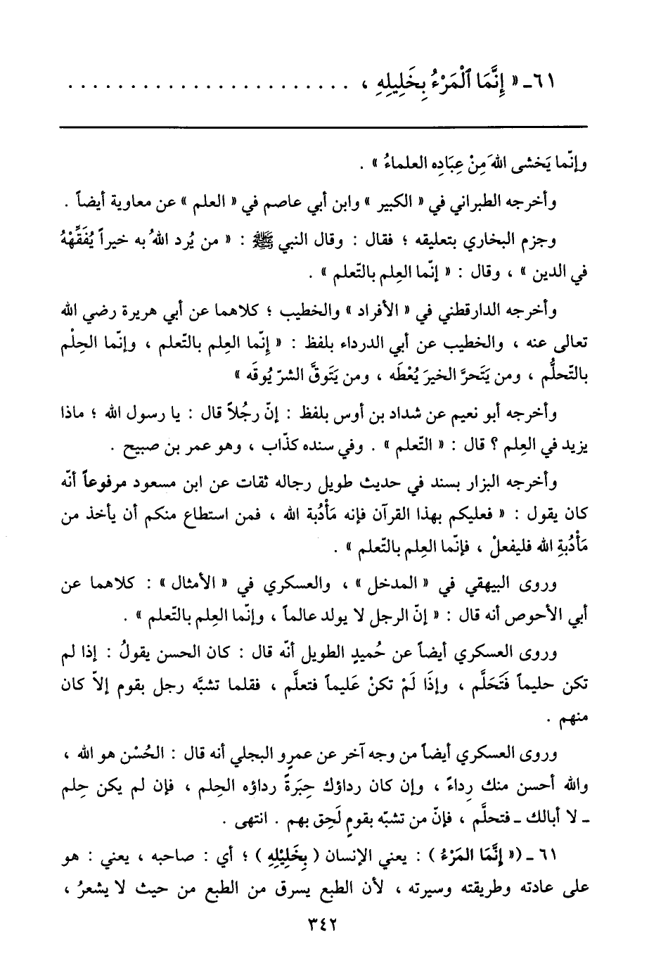 61- ( «إنّما المرء) : يعني الإنسان (بخليله) ؛ أي: صاحبه، يعني: هو على عادته وطريقته وسيرته، لأن الطبع يسرق من الطبع من حيث لا يشعر،