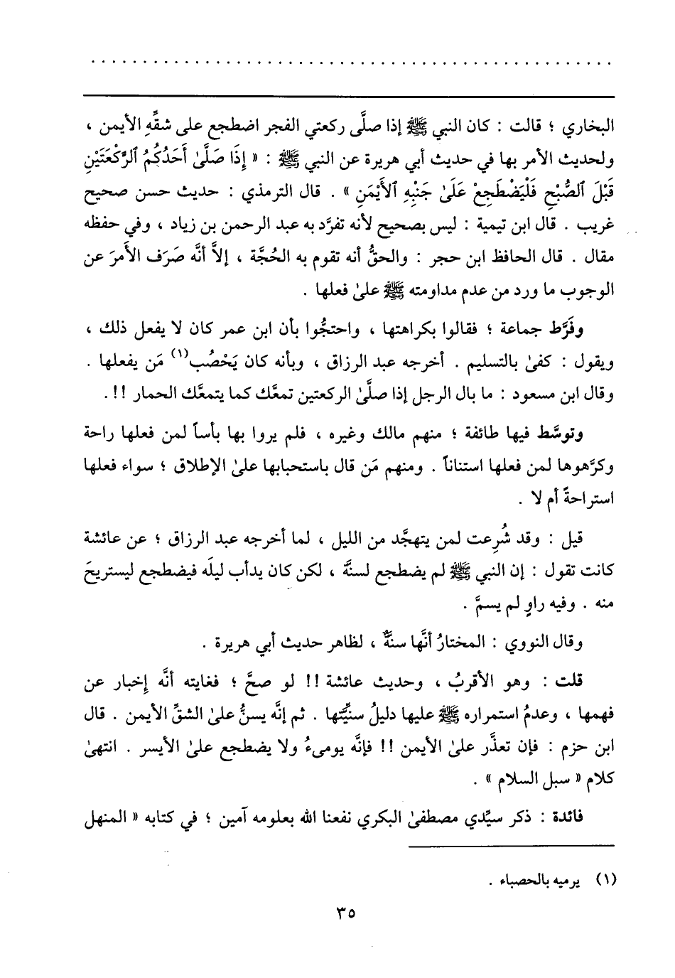 قلت: وهو الأقرب، وحديث عائشة!! لو صحّ؛ فغايته أنّه إخبار عن فهمها، وعدم استمراره صلى الله عليه وسلّم عليها دليل سنّيّتها. ثم إنّه يسنّ على الشقّ الأيمن. قال ابن حزم: فإن تعذّر على الأيمن!! فإنّه يومئ ولا يضطجع على الأيسر. انتهى كلام «سبل السلام» .