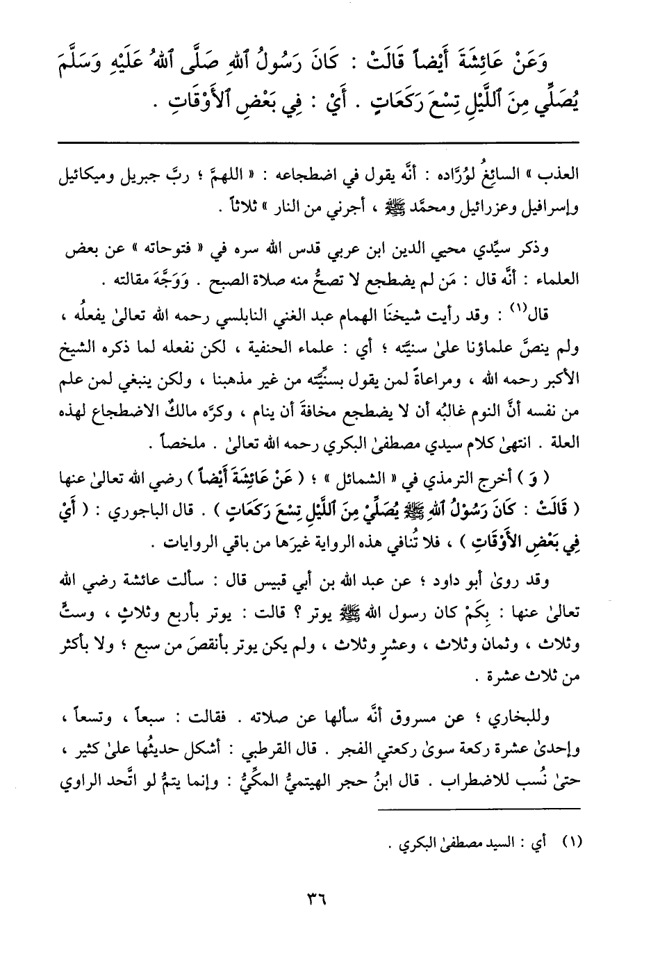 قال «1» : وقد رأيت شيخنا الهمام عبد الغني النابلسي رحمه الله تعالى يفعله، ولم ينصّ علماؤنا على سنيّته؛ أي: علماء الحنفية، لكن نفعله لما ذكره الشيخ الأكبر رحمه الله، ومراعاة لمن يقول بسنّيّته من غير مذهبنا، ولكن ينبغي لمن علم من نفسه أنّ النوم غالبه ألايضطجع مخافة أن ينام، وكرّه مالك الاضطجاع لهذه العلة. انتهى كلام سيدي مصطفى البكري رحمه الله تعالى. ملخصا.