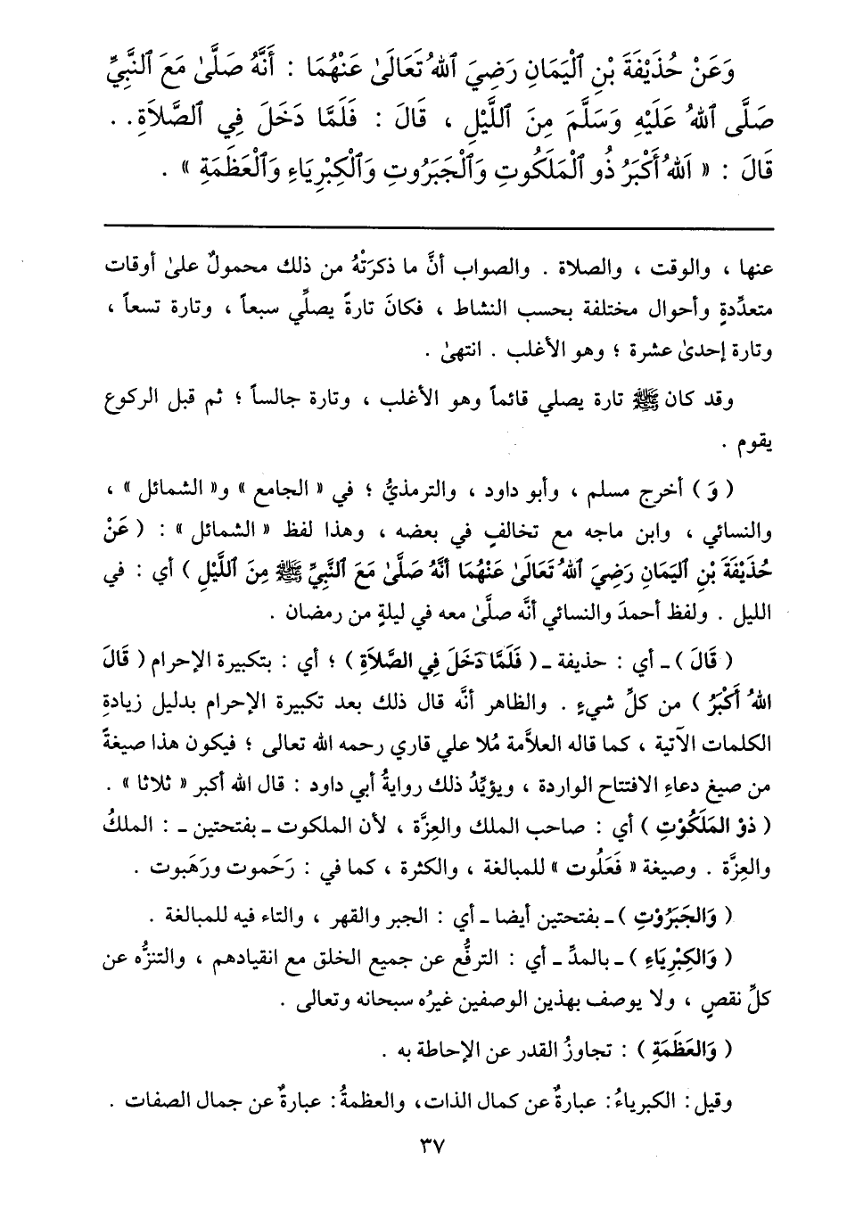 وعن حذيفة بن اليمان رضي الله تعالى عنهما: أنّه صلّى مع النّبيّ صلّى الله عليه وسلّم من اللّيل، قال: فلمّا دخل في الصّلاة..
