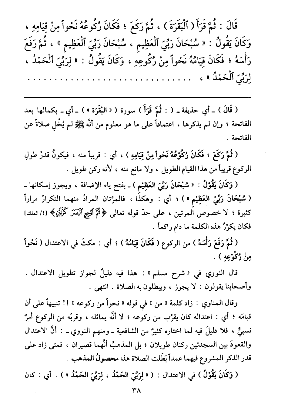وقال المناوي: زاد كلمة «من» في قوله «نحوا من ركوعه» !! تنبيها على أن قيامه؛ أي: اعتداله كان يقرب من ركوعه؛ لا أنّه يماثله، وقربه من الركوع أمر نسبيّ، فلا دليل فيه لما اختاره كثير من الشافعية- ومنهم النووي-: أنّ الاعتدال والقعود بين السجدتين ركنان طويلان؛ بل المذهب أنّهما قصيران، فمتى زاد على قدر الذكر المشروع فيهما عمدا بطلت الصلاة هذا محصول المذهب.