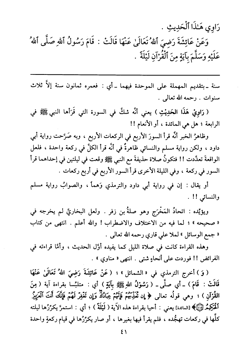 وعن عائشة رضي الله تعالى عنها قالت: قام رسول الله صلّى الله عليه وسلّم باية من القرآن ليلة.