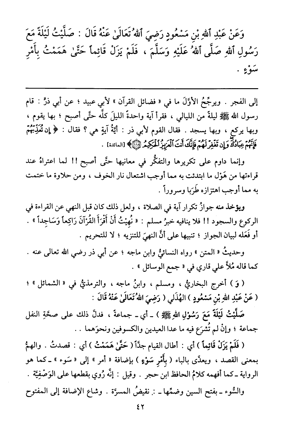 وعن عبد الله بن مسعود رضي الله تعالى عنه قال: صلّيت ليلة مع رسول الله صلّى الله عليه وسلّم، فلم يزل قائما حتّى هممت بأمر سوء.
