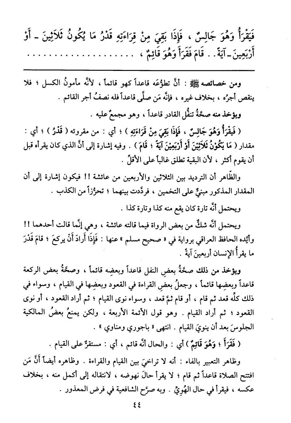 فيقرأ وهو جالس، فإذا بقي من قراءته قدر ما يكون ثلاثين- أو أربعين- آية.. قام فقرأ وهو قائم، ...