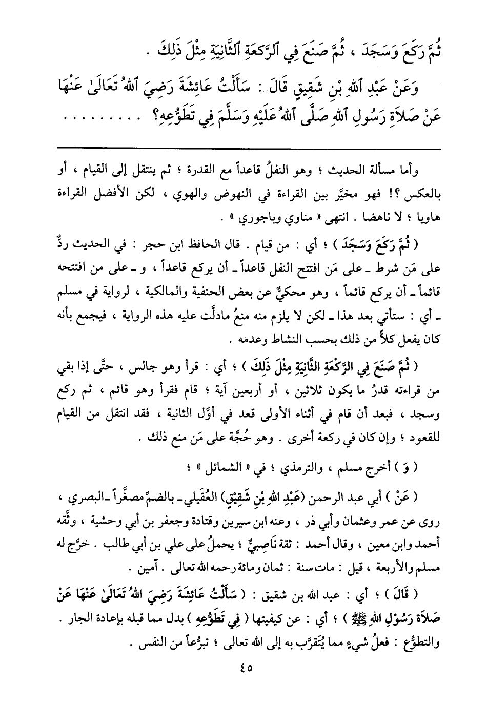 وعن عبد الله بن شقيق قال: سألت عائشة رضي الله تعالى عنها عن صلاة رسول الله صلّى الله عليه وسلّم في تطوّعه؟ ...
