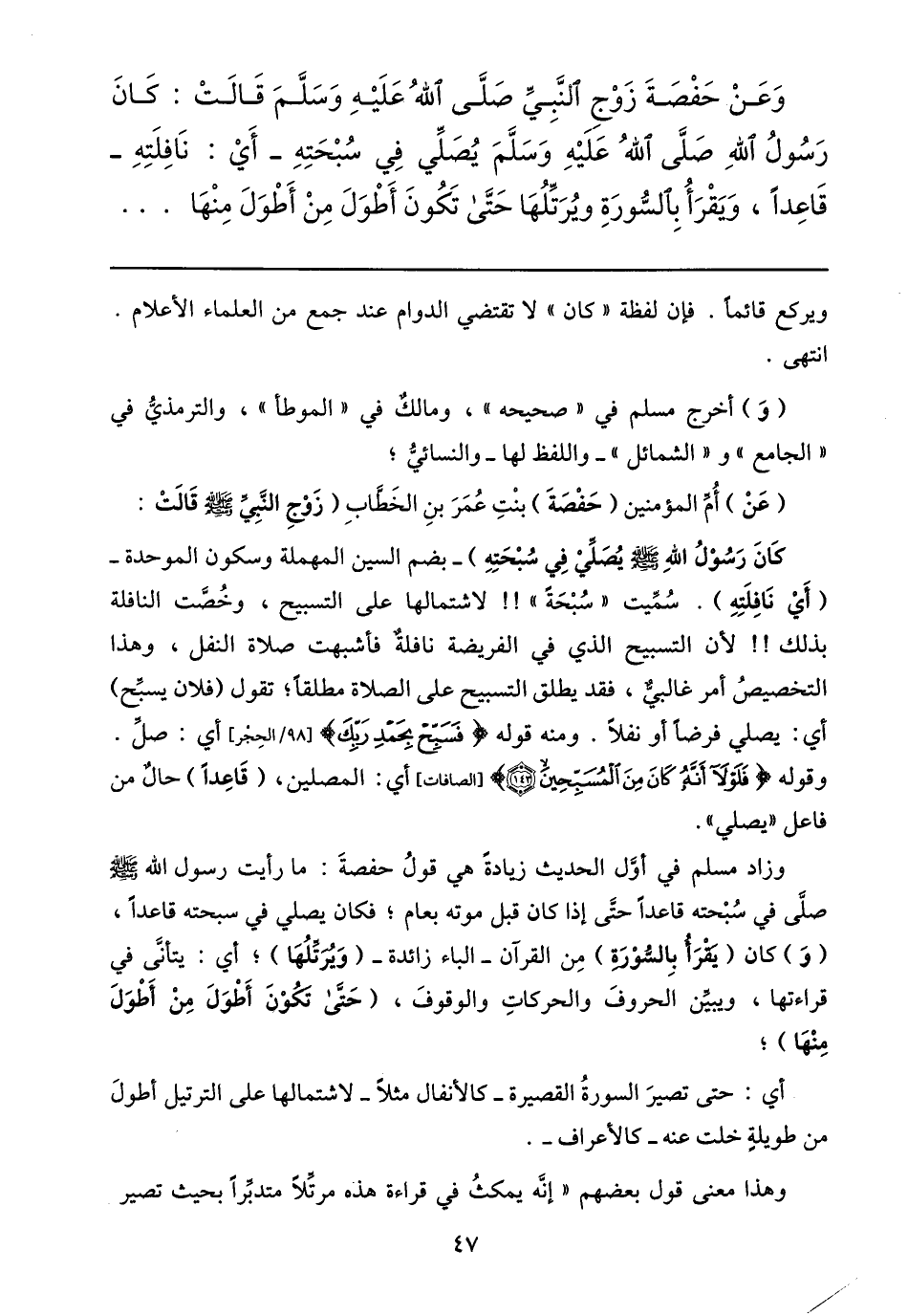 وعن حفصة زوج النّبيّ صلّى الله عليه وسلّم قالت: كان رسول الله صلّى الله عليه وسلّم يصلّي في سبحته- أي: نافلته- قاعدا، ويقرأ بالسّورة ويرتّلها حتّى تكون أطول من أطول منها ...