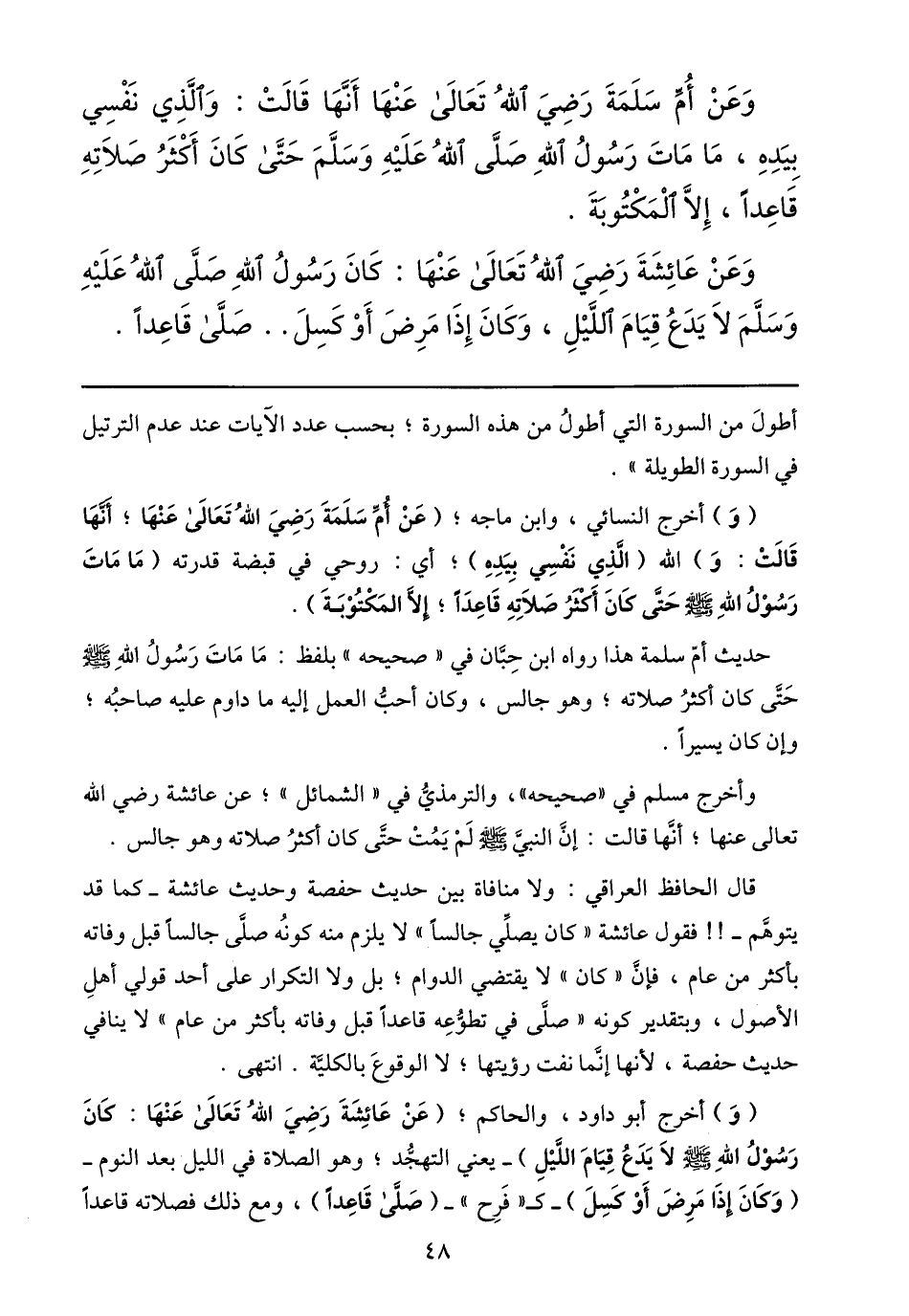 وعن أمّ سلمة رضي الله تعالى عنها أنّها قالت: والّذي نفسي بيده، ما مات رسول الله صلّى الله عليه وسلّم حتّى كان أكثر صلاته قاعدا، إلّا المكتوبة.
