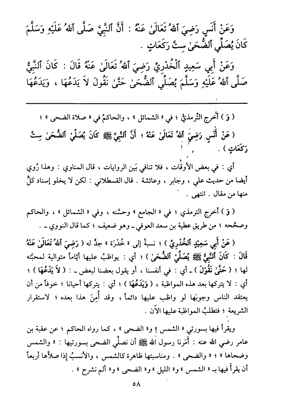 وعن أنس رضي الله تعالى عنه: أنّ النّبيّ صلّى الله عليه وسلّم كان يصلّي الضّحى ستّ ركعات.