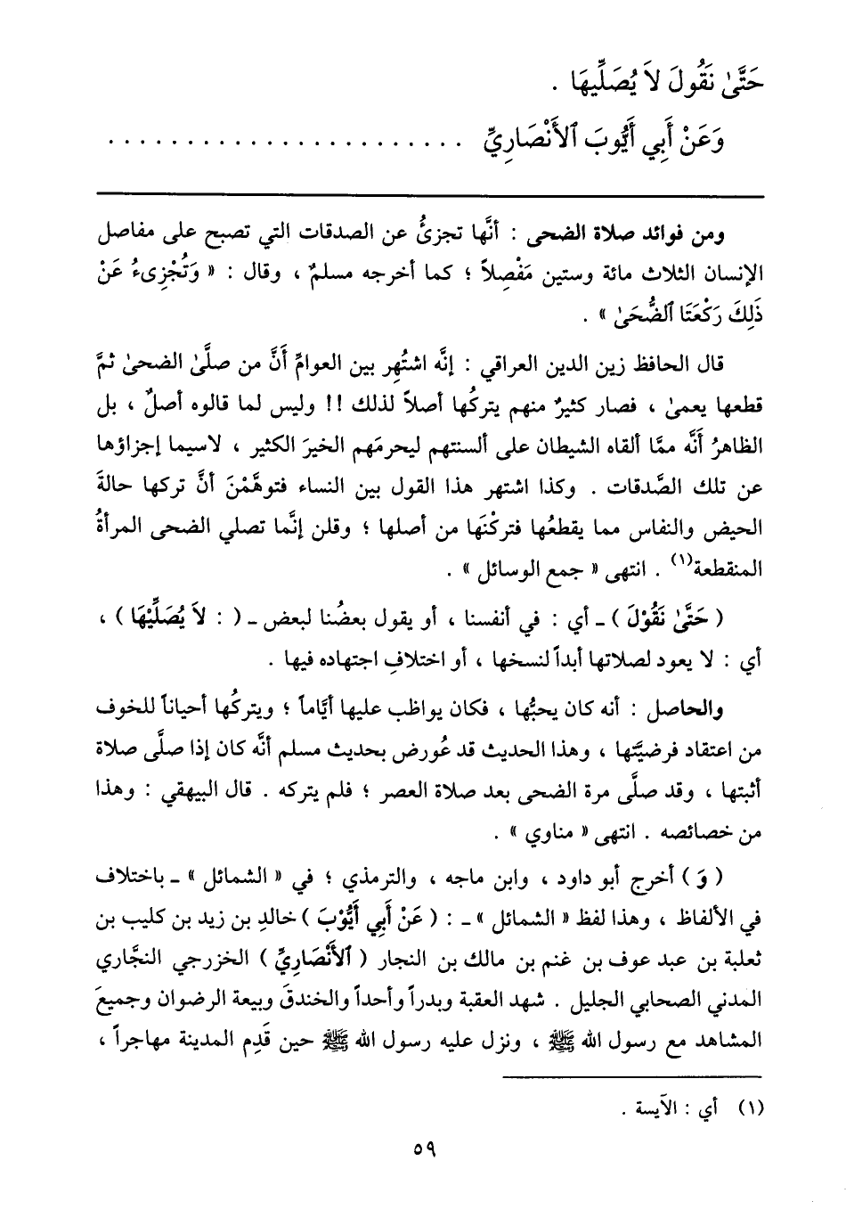 قال الحافظ زين الدين العراقي: إنّه اشتهر بين العوامّ أنّ من صلّى الضحى ثمّ قطعها يعمى، فصار كثير منهم يتركها أصلا لذلك!! وليس لما قالوه أصل، بل الظاهر أنّه ممّا ألقاه الشيطان على ألسنتهم ليحرمهم الخير الكثير، لا سيما إجزاؤها عن تلك الصّدقات. وكذا اشتهر هذا القول بين النساء فتوهّمن أنّ تركها حالة الحيض والنفاس مما يقطعها فتركنها من أصلها؛ وقلن إنّما تصلي الضحى المرأة المنقطعة «1» . انتهى «جمع الوسائل» .