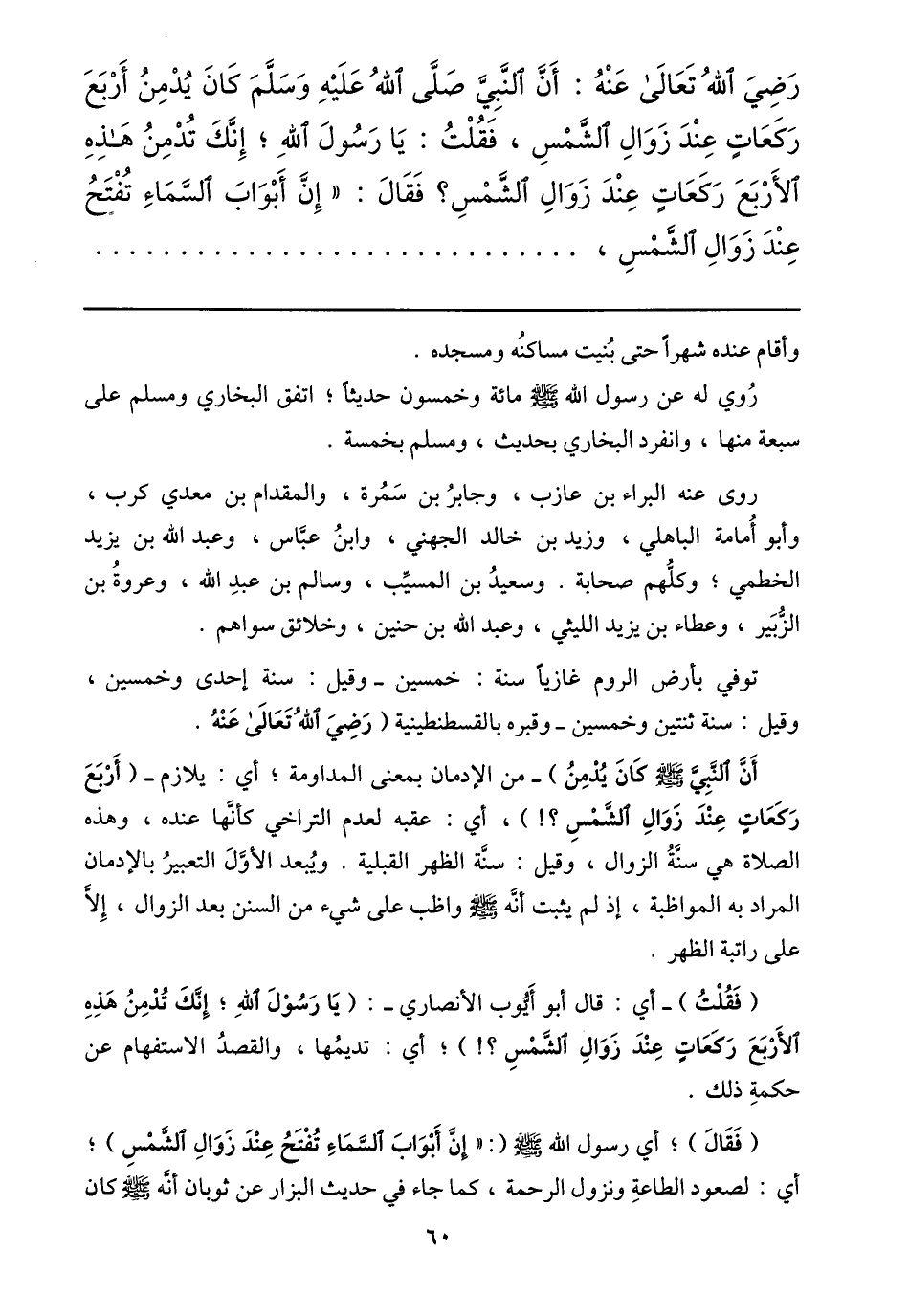 رضي الله تعالى عنه: أنّ النّبيّ صلّى الله عليه وسلّم كان يدمن أربع ركعات عند زوال الشّمس، فقلت: يا رسول الله؛ إنّك تدمن هذه الأربع ركعات عند زوال الشّمس؟ فقال: «إنّ أبواب السّماء تفتح عند زوال الشّمس، ...
