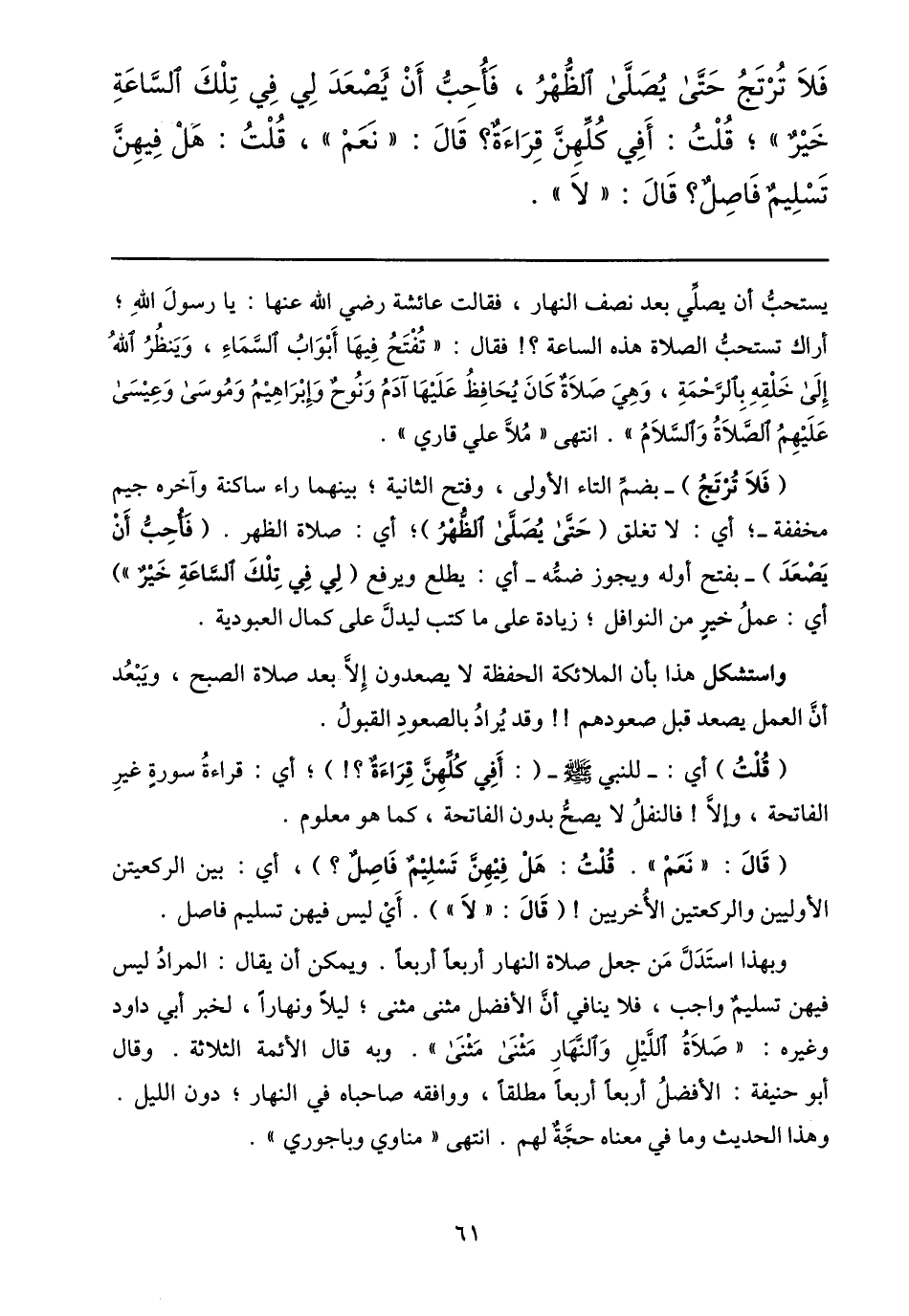 فلا ترتج حتّى يصلّى الظّهر، فأحبّ أن يصعد لي في تلك السّاعة خير» ؛ قلت: أفي كلّهنّ قراءة؟ قال: «نعم» ، قلت: هل فيهنّ تسليم فاصل؟ قال: «لا» .