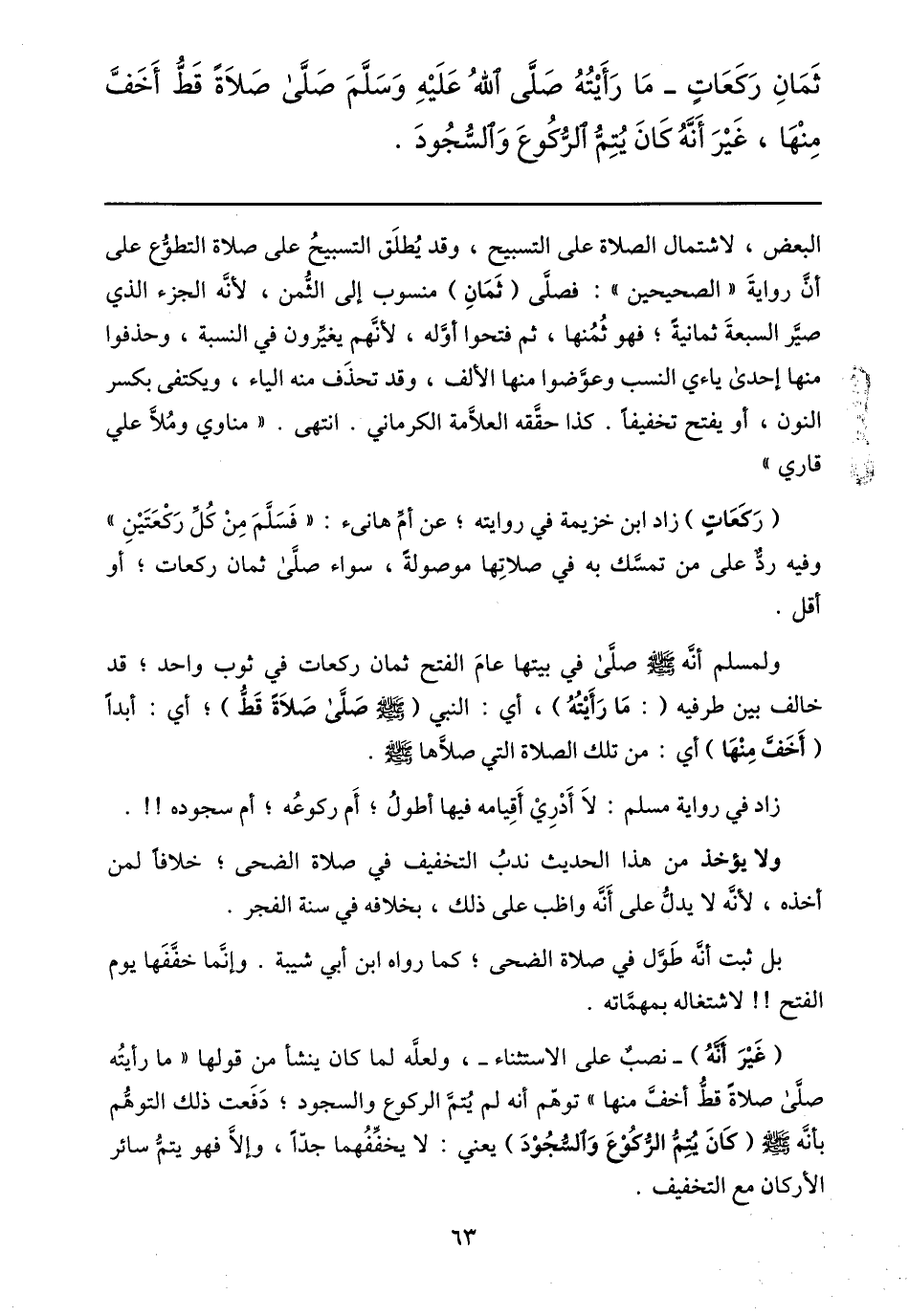 (ركعات) زاد ابن خزيمة في روايته؛ عن أمّ هانئ: «فسلّم من كلّ ركعتين» وفيه ردّ على من تمسّك به في صلاتها موصولة، سواء صلّى ثمان ركعات؛ أو أقل.