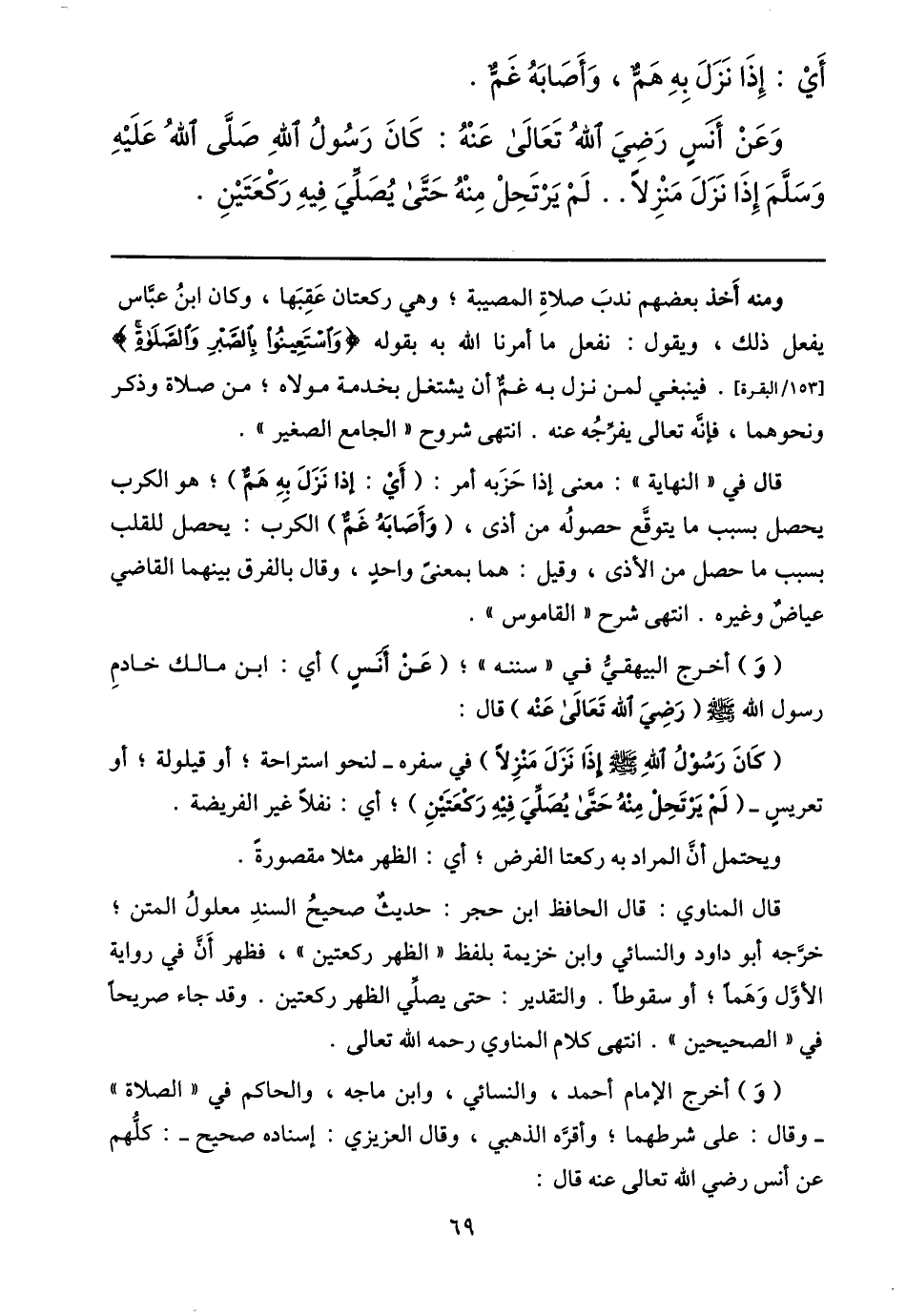 وعن أنس رضي الله تعالى عنه: كان رسول الله صلّى الله عليه وسلّم إذا نزل منزلا.. لم يرتحل منه حتّى يصلّي فيه ركعتين.