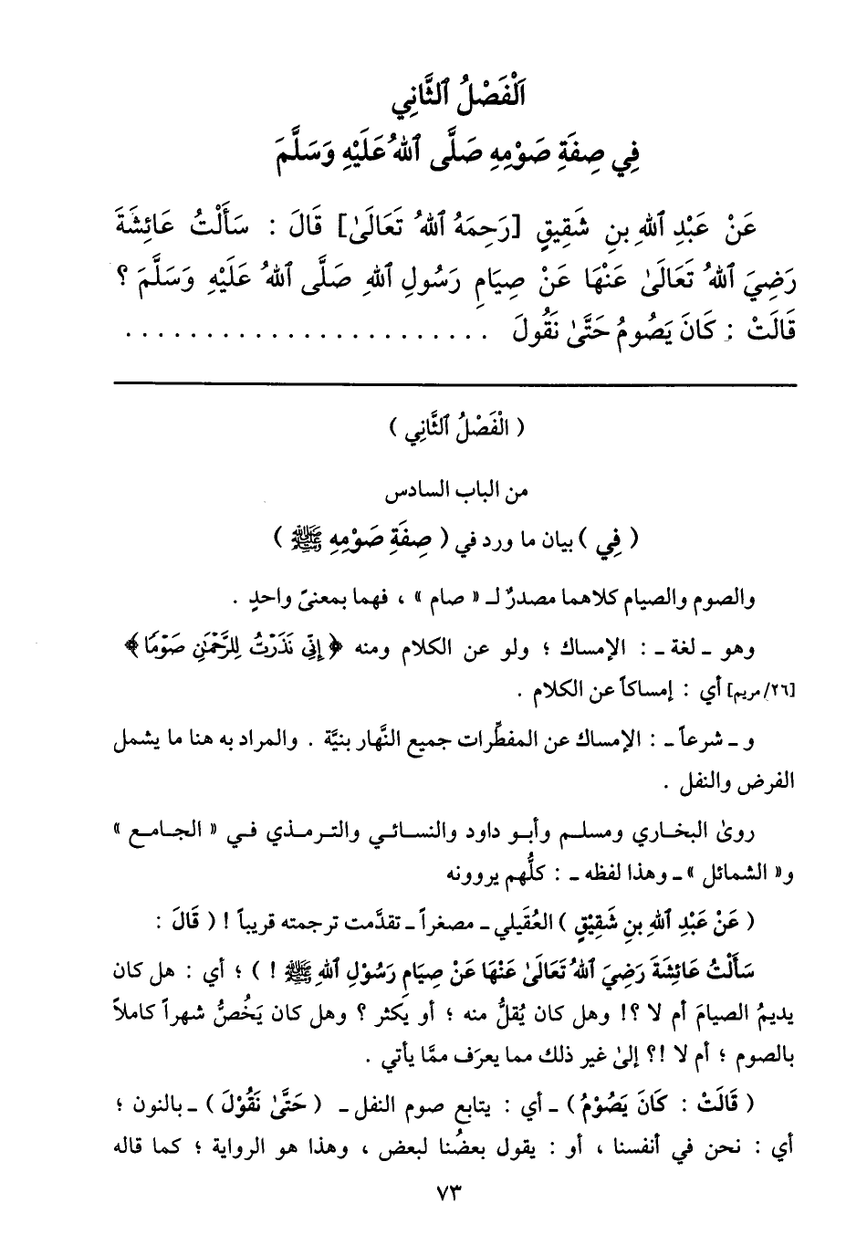 الفصل الثّاني في صفة صومه صلّى الله عليه وسلّم عن عبد الله بن شقيق [رحمه الله تعالى] قال: سألت عائشة رضي الله تعالى عنها عن صيام رسول الله صلّى الله عليه وسلّم؟