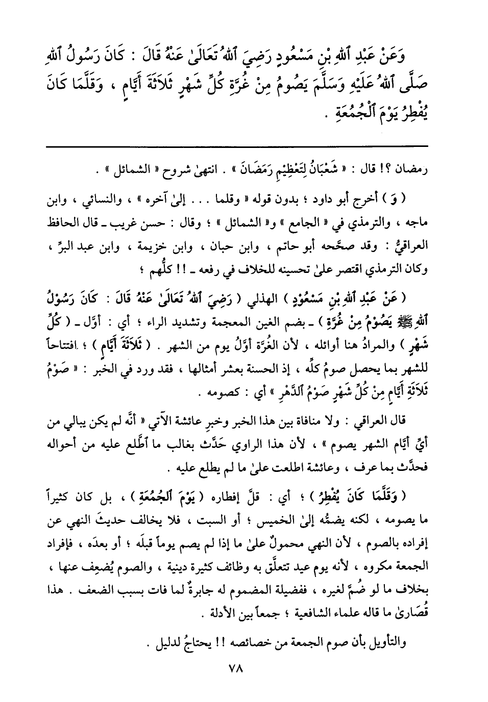 وعن عبد الله بن مسعود رضي الله تعالى عنه قال: كان رسول الله صلّى الله عليه وسلّم يصوم من غرّة كلّ شهر ثلاثة أيّام، وقلّما كان يفطر يوم الجمعة.