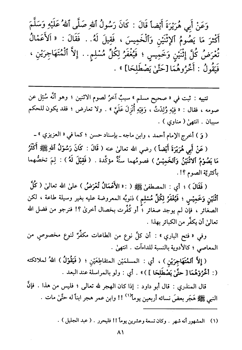 وعن أبي هريرة أيضا قال: كان رسول الله صلّى الله عليه وسلّم أكثر ما يصوم الإثنين والخميس، فقيل له.. فقال: «الأعمال تعرض كلّ إثنين وخميس؛ فيغفر لكلّ مسلم.. إلّا المتهاجرين، فيقول: أخّروهما [حتّى يصطلحا] » .