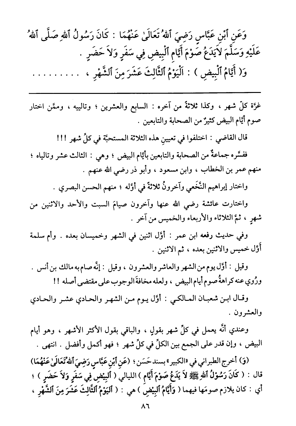 (و) أخرج الطبراني في «الكبير» بسند حسن؛ (عن ابن عبّاس رضي الله تعالى عنهما) قال: (كان رسول الله صلى الله عليه وسلّم لا يدع صوم أيّام) الليالي (البيض في سفر ولا حضر) ؛ أي: كان يلازم صومها فيهما (وأيّام البيض) هي: (اليوم الثّالث عشر من الشّهر،
