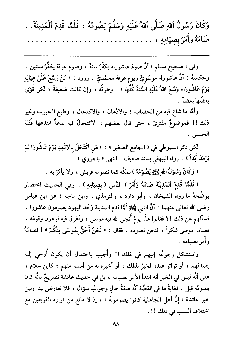 واستشكل رجوعه إليهم في ذلك!! وأجيب باحتمال أن يكون أوحي إليه بصدقهم، أو تواتر عنده الخبر بذلك، أو أخبره به من أسلم منهم؛ كابن سلام، على أنّه ليس في الخبر أنّه ابتدأ الأمر بصيامه، بل في حديث عائشة تصريح بأنّه كان يصومه قبل. فغاية ما في القصّة أنّه صفة حال وجواب سؤال؛ فلا تعارض بينه وبين خبر عائشة «إنّ أهل الجاهلية كانوا يصومونه» ، إذ لا مانع من توارد الفريقين مع اختلاف السبب في ذلك!!.
