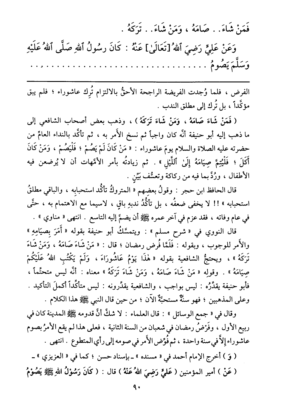 (فمن شاء صامه، ومن شاء تركه) ، وذهب بعض أصحاب الشافعي إلى ما ذهب إليه أبو حنيفة أنّه كان واجبا ثم نسخ الأمر به، ثم تأكّد بالنداء العامّ من حضرته عليه الصلاة والسلام يوم عاشوراء: «من كان لم يصم؛ فليصم، ومن كان أكل؛ فليتمّ صيامه إلى اللّيل» . ثم زيادته بأمر الأمّهات ألايرضعن فيه الأطفال، وردّ بما فيه من ركاكة وتعسّف بيّن.
