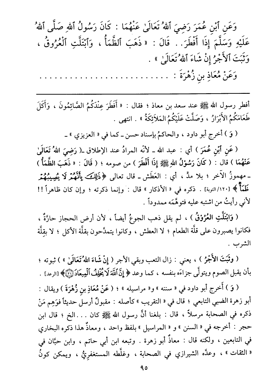 وعن ابن عمر رضي الله تعالى عنهما: كان رسول الله صلّى الله عليه وسلّم إذا أفطر.. قال: «ذهب الظّمأ، وابتلّت العروق، وثبت الأجر إن شاء الله تعالى» .