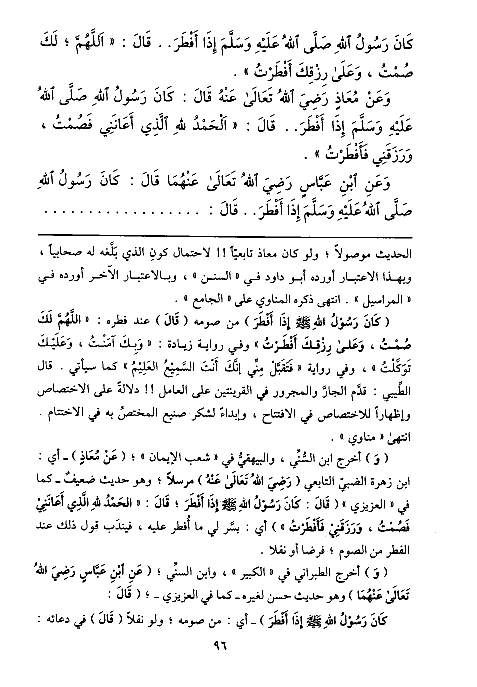 ابن زهرة الضبيّ التابعي (رضي الله تعالى عنه) مرسلا؛ وهو حديث ضعيف- كما في «العزيزي» (قال: كان رسول الله صلى الله عليه وسلّم إذا أفطر؛ قال: «الحمد لله الّذي أعانني فصمت، ورزقني فأفطرت» ) أي: يسّر لي ما أفطر عليه، فيندب قول ذلك عند الفطر من الصوم؛ فرضا أو نفلا.