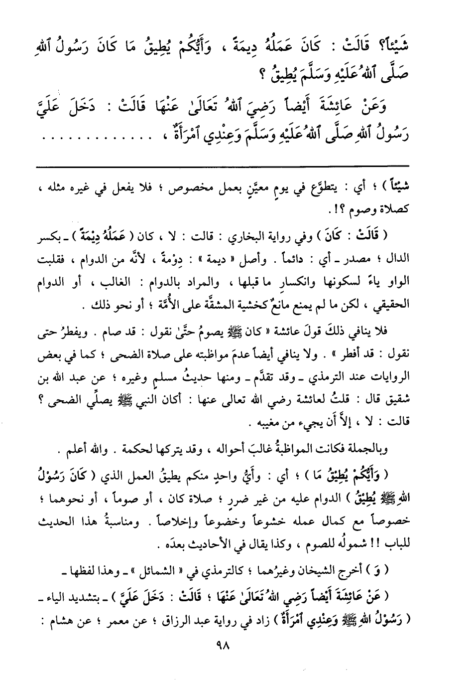 شيئا؟ قالت: كان عمله ديمة، وأيّكم يطيق ما كان رسول الله صلّى الله عليه وسلّم يطيق؟