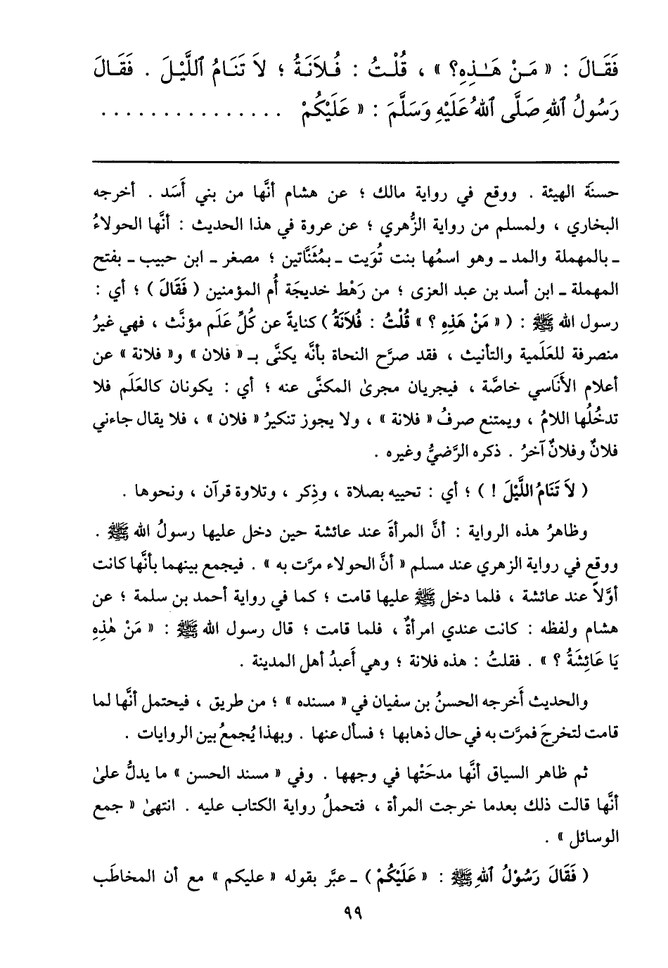 فقال: «من هذه؟» ، قلت: فلانة؛ لا تنام اللّيل. فقال رسول الله صلّى الله عليه وسلّم: «عليكم ...