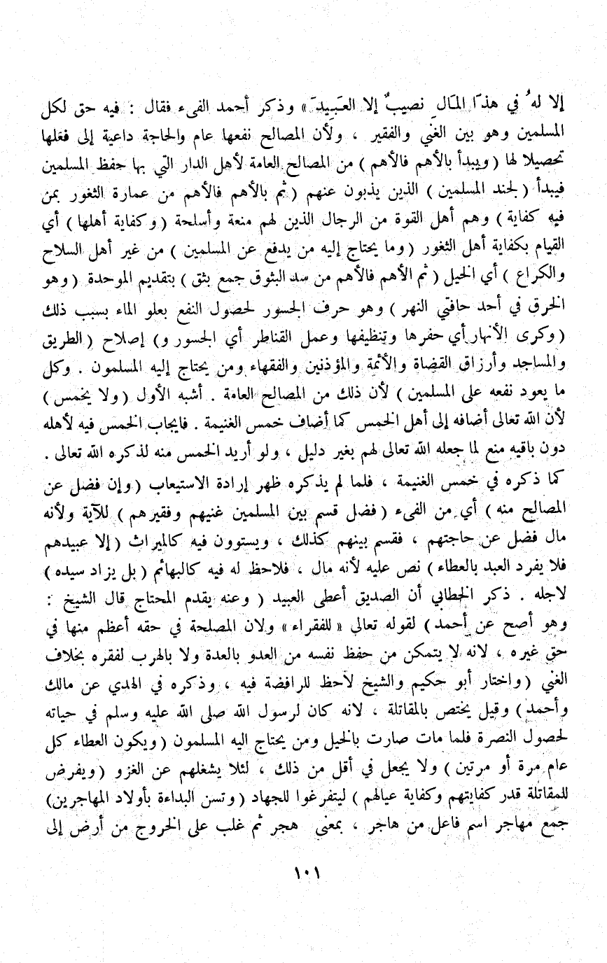 إلَّا لَهُ فِي هَذَا الْمَالِ نَصِيبٌ إلَّا الْعَبِيدَ وَذَكَرَ أَحْمَدُ الْفَيْءَ فَقَالَ: فِيهِ حَقٌّ لِكُلِّ الْمُسْلِمِينَ وَهُوَ بَيْن الْغَنِيِّ وَالْفَقِيرِ، وَلِأَنَّ الْمَصَالِحَ نَفْعُهَا عَامٌّ وَالْحَاجَةُ دَاعِيَةٌ إلَى فِعْلِهَا تَحْصِيلًا لَهَا.