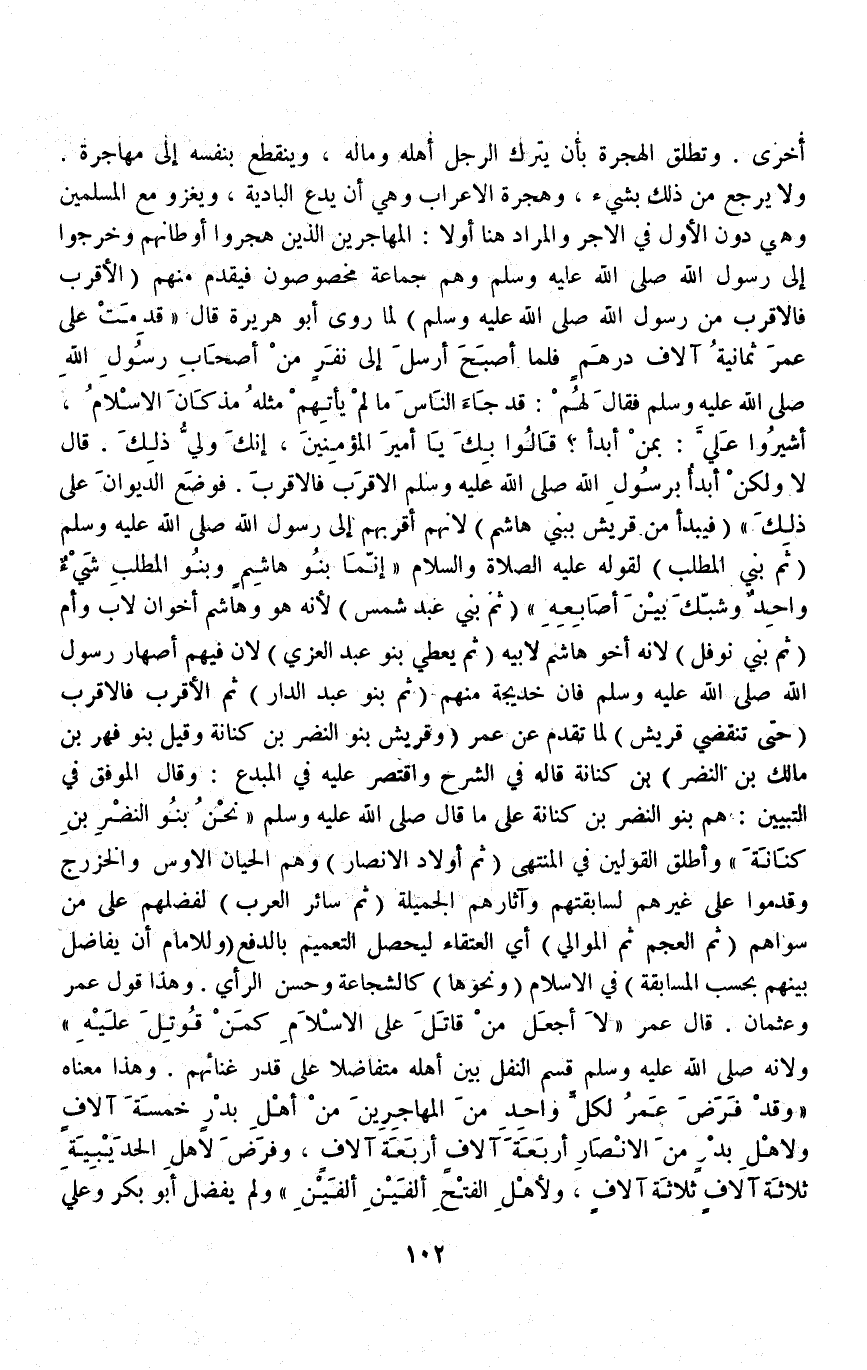 وَلَا يَرْجِعُ مِنْ ذَلِكَ بِشَيْءٍ، وَهِجْرَةُ الْأَعْرَابِ وَهِيَ أَنْ يَدَعَ الْبَادِيَةَ وَيَغْزُوَ مَعَ الْمُسْلِمِينَ وَهِيَ دُونَ الْأَوَّلِ فِي الْأَجْرِ وَالْمُرَادُ هُنَا أَوَّلًا: الْمُهَاجِرِينَ الَّذِينَ هَجَرُوا أَوْطَانَهُمْ وَخَرَجُوا إلَى رَسُولِ اللَّهِ - صَلَّى اللَّهُ عَلَيْهِ وَسَلَّمَ - وَهُمْ جَمَاعَةٌ مَخْصُوصُونَ فَيُقَدَّمُ مِنْهُمْ (الْأَقْرَبُ فَالْأَقْرَبُ مِنْ رَسُولِ اللَّهِ - صَلَّى اللَّهُ عَلَيْهِ وَسَلَّمَ -) لِمَا رَوَى أَبُو هُرَيْرَةَ قَالَ " قَدِمَتْ عَلَى عُمَرَ ثَمَانِيَةُ آلَافِ دِرْهَمٍ فَلَمَّا أَصْبَحَ أَرْسَلَ إلَى نَفَرٍ مِنْ أَصْحَابِ رَسُولِ اللَّهِ - صَلَّى اللَّهُ عَلَيْهِ وَسَلَّمَ - فَقَالَ لَهُمْ: قَدْ جَاءَ النَّاسَ مَا لَمْ يَأْتِهِمْ مِثْلُهُ مُذْ كَانَ الْإِسْلَامُ، أَشِيرُوا عَلَيَّ بِمَنْ أَبْدَأُ؟ قَالُوا: بِك يَا أَمِيرَ الْمُؤْمِنِينَ إنَّك وَلِيُّ ذَلِكَ قَالَ لَا وَلَكِنْ أَبْدَأُ بِرَسُولِ اللَّهِ - صَلَّى اللَّهُ عَلَيْهِ وَسَلَّمَ - الْأَقْرَبَ فَالْأَقْرَبَ فَوَضَعَ الدِّيوَانَ عَلَى ذَلِكَ " (فَيَبْدَأُ مِنْ قُرَيْشٍ بِبَنِي هَاشِمٍ) لِأَنَّهُمْ أَقْرَبُهُمْ إلَى رَسُولِ اللَّهِ - صَلَّى اللَّهُ عَلَيْهِ وَسَلَّمَ - (ثُمَّ بَنِي الْمُطَّلِبِ) لِقَوْلِهِ - عَلَيْهِ الصَّلَاةُ وَالسَّلَامُ - «إنَّمَا بَنُو هَاشِمٍ وَبَنُو الْمُطَّلِبِ شَيْءٌ وَاحِدٌ وَشَبَّكَ بَيْنَ أَصَابِعِهِ» (ثُمَّ بَنِي عَبْدِ شَمْسٍ) لِأَنَّهُ هُوَ وَهَاشِمٌ أَخَوَانِ لِأَبٍ وَأُمٍّ (ثُمَّ بَنِي نَوْفَلٍ) لِأَنَّهُ أَخُو هَاشِمٍ لِأَبِيهِ (ثُمَّ يُعْطَى بَنُو عَبْدِ الْعُزَّى) ؛ لِأَنَّ فِيهِمْ أَصْهَارَ رَسُولِ اللَّهِ - صَلَّى اللَّهُ عَلَيْهِ وَسَلَّمَ - فَإِنَّ خَدِيجَةَ مِنْهُمْ (ثُمَّ بَنِي عَبْدِ الدَّارِ) ثُمَّ الْأَقْرَبُ فَالْأَقْرَبُ (حَتَّى تَنْقَضِيَ قُرَيْشٌ) لِمَا تَقَدَّمَ عَنْ عُمَرَ (وَقُرَيْشُ بَنُو النَّضْرِ بْنِ كِنَانَةَ وَقِيلَ بَنُو فِهْرِ بْنِ مَالكِ بْنِ النَّضْرِ بْنِ كِنَانَةَ) قَالَهُ فِي الشَّرْحِ وَاقْتَصَرَ عَلَيْهِ فِي الْمُبْدِعِ: وَقَالَ الْمُوَفَّقُ فِي التَّبْيِينِ: هُمْ بَنُو النَّضْرِ بْنِ كِنَانَةَ عَلَى مَا قَالَ - صَلَّى اللَّهُ عَلَيْهِ وَسَلَّمَ - «نَحْنُ بَنُو النَّضْرِ بْنِ كِنَانَةَ» وَأَطْلَقَ الْقَوْلَيْنِ فِي الْمُنْتَهَى (ثُمَّ أَوْلَادُ الْأَنْصَارِ) وَهُمْ الْحَيَّانِ الْأَوْسُ وَالْخَزْرَجُ وَقُدِّمُوا عَلَى غَيْرِهِمْ لِسَابِقَتِهِمْ وَآثَارِهِمْ الْجَمِيلَةِ (ثُمَّ سَائِرُ الْعَرَبِ) لِفَضْلِهِمْ عَلَى مَنْ سِوَاهُمْ (ثُمَّ الْعَجَمُ ثُمَّ الْمَوَالِي) أَيْ: الْعُتَقَاءُ لِيَحْصُلَ التَّعْمِيمُ بِالدَّفْعِ (وَلِلْإِمَامِ أَنْ يُفَاضِلَ بَيْنَهُمْ بِحَسَبِ الْمُسَابَقَةِ) فِي الْإِسْلَامِ (وَنَحْوِهَا) كَالشَّجَاعَةِ وَحُسْنِ الرَّأْيِ.