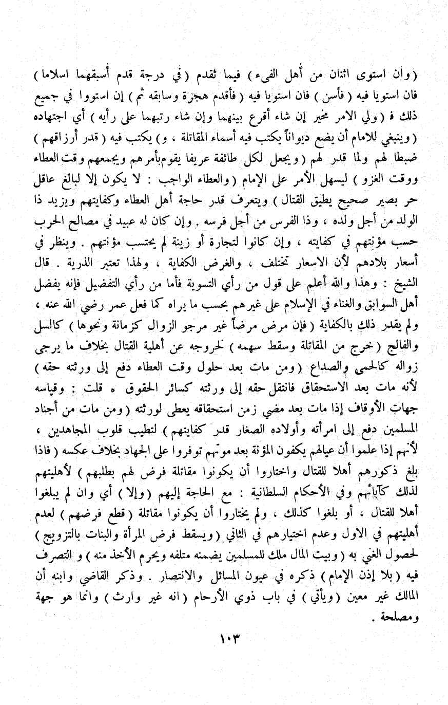 (وَالْعَطَاءُ الْوَاجِبُ: لَا يَكُونُ إلَّا لِبَالِغٍ عَاقِلٍ حُرٍّ بَصِيرٍ صَحِيحٍ يُطِيقُ الْقِتَالَ) وَيَتَعَرَّفُ قَدْرَ حَاجَةِ أَهْلِ الْعَطَاءِ وَكِفَايَتِهِمْ وَيَزِيدُ ذَا الْوَلَدِ مِنْ أَجْلِ وَلَدِهِ، وَذَا الْفَرَسِ مِنْ أَجْلِ فَرَسِهِ وَإِنْ كَانَ لَهُ عَبِيدٌ فِي مَصَالِحِ الْحَرْبِ حَسَبَ مُؤْنَتِهِمْ فِي كِفَايَتِهِ، وَإِنْ كَانُوا لِتِجَارَةٍ أَوْ زِينَةٍ لَمْ يَحْتَسِبْ مُؤْنَتَهُمْ وَيَنْظُرُ فِي أَسْعَارِ بِلَادِهِمْ لِأَنَّ الْأَسْعَارَ تَخْتَلِفُ، وَالْغَرَضُ الْكِفَايَةُ، وَلِهَذَا تُعْتَبَرُ الذُّرِّيَّةُ قَالَ الشَّيْخُ وَهَذَا وَاَللَّهُ أَعْلَمُ عَلَى قَوْلِ مَنْ رَأَى التَّسْوِيَةَ فَأَمَّا مَنْ رَأَى التَّفْضِيلَ فَإِنَّهُ يُفَضِّلُ أَهْلَ السَّوَابِقِ وَالْغِنَاءِ فِي الْإِسْلَامِ عَلَى غَيْرِهِمْ بِحَسْبِ مَا يَرَاهُ كَمَا فَعَلَ عُمَرُ - رَضِيَ اللَّهُ تَعَالَى عَنْهُ - وَلَمْ يُقَدِّرْ ذَلِكَ بِالْكِفَايَةِ.