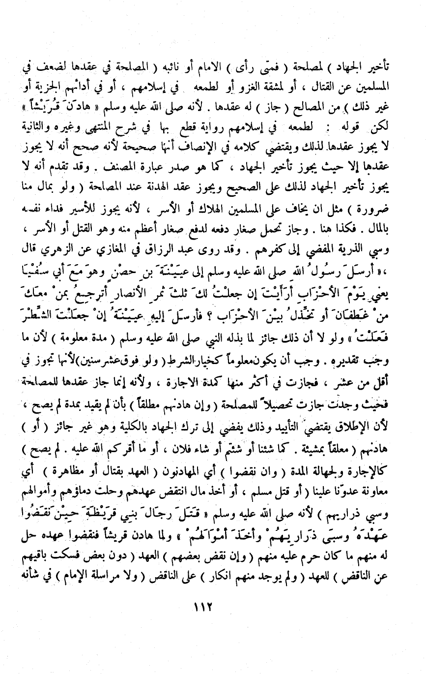 تَأْخِيرُ الْجِهَادِ) لِمَصْلَحَةٍ (فَمَتَى رَأَى) الْإِمَامُ أَوْ نَائِبُهُ (الْمَصْلَحَةَ فِي عَقْدِهَا لِضَعْفٍ فِي الْمُسْلِمِينَ عَنْ الْقِتَالِ، أَوْ لِمَشَقَّةِ الْغَزْوِ أَوْ لِطَمَعِهِ فِي إسْلَامِهِمْ، أَوْ فِي أَدَائِهِمْ الْجِزْيَةَ أَوْ غَيْرِ ذَلِكَ) مِنْ الْمَصَالِحِ (جَازَ) لَهُ عَقْدُهَا؛ لِأَنَّهُ - صَلَّى اللَّهُ عَلَيْهِ وَسَلَّمَ - " هَادَنَ قُرَيْشًا لَكِنْ قَوْلُهُ: لِطَمَعِهِ فِي إسْلَامِهِمْ رِوَايَةٌ قَطَعَ بِهَا فِي شَرْحِ الْمُنْتَهَى وَغَيْرِهِ وَالثَّانِيَةُ لَا يَجُوزُ عَقْدُهَا لِذَلِكَ وَيَقْتَضِي كَلَامُهُ فِي الْإِنْصَافِ أَنَّهَا صَحِيحَةٌ؛ لِأَنَّهُ صَحَّحَ أَنَّهُ لَا يَجُوزُ عَقْدُهَا إلَّا حَيْثُ يَجُوزُ تَأْخِيرُ الْجِهَادِ، كَمَا هُوَ صَدْرُ عِبَارَةِ الْمُصَنِّفِ وَقَدْ تَقَدَّمَ أَنَّهُ لَا يَجُوزُ تَأْخِيرُ الْجِهَادِ لِذَلِكَ عَلَى الصَّحِيحِ.