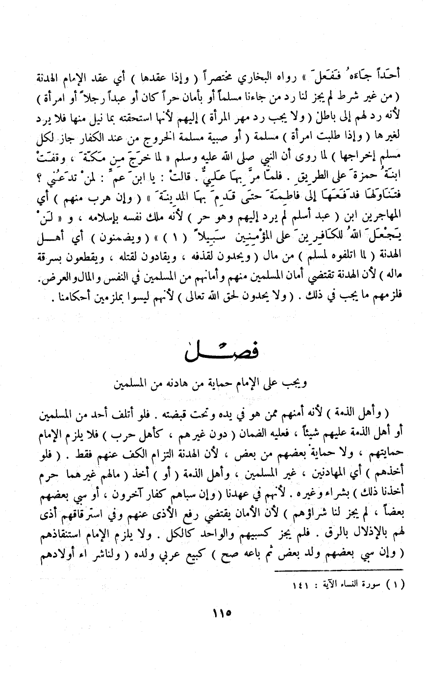 (فَصْلٌ وَيَجِبُ عَلَى الْإِمَامِ حِمَايَةُ مَنْ هَادَنَهُ مِنْ الْمُسْلِمِينَ وَأَهْلِ الذِّمَّةِ) ؛ لِأَنَّهُ أَمَّنَهُمْ مِمَّنْ هُوَ فِي يَدهِ وَتَحْتَ قَبْضَتِهِ فَلَوْ أَتْلَفَ أَحَدٌ مِنْ الْمُسْلِمِينَ أَوْ أَهْلُ الذِّمَّةِ عَلَيْهِمْ شَيْئًا، فَعَلَيْهِ الضَّمَانُ (دُونَ غَيْرِهِمْ، كَأَهْلِ حَرْبٍ) فَلَا يَلْزَمُ الْإِمَامَ حِمَايَتُهُمْ، وَلَا حِمَايَةُ بَعْضِهِمْ مِنْ بَعْضٍ؛ لِأَنَّ الْهُدْنَةَ الْتِزَامُ الْكَفِّ عَنْهُمْ فَقَطْ (فَلَوْ أَخَذَهُمْ) أَيْ: الْمُهَادَنِينَ غَيْرُ الْمُسْلِمِينَ، وَأَهْلُ الذِّمَّةِ (أَوْ) أَخَذَ (مَالَهُمْ غَيْرُهُمَا حَرُمَ أَخْذُنَا ذَلِكَ) بِشِرَاءٍ وَغَيْرِهِ؛ لِأَنَّهُمْ فِي عَهْدِنَا (وَإِنْ سَبَاهُمْ كُفَّارٌ آخَرُونَ أَوْ سَبَى بَعْضُهُمْ بَعْضًا، لَمْ يَجُزْ لَنَا شِرَاؤُهُمْ) ؛ لِأَنَّ الْأَمَانَ يَقْتَضِي رَفْعَ الْأَذَى عَنْهُمْ وَفِي اسْتِرْقَاقِهِمْ أَذًى لَهُمْ بِالْإِذْلَالِ بِالرِّقِّ فَلَمْ يَجُزْ كَسَبْيِهِمْ وَالْوَاحِدُ كَالْكُلِّ وَلَا يَلْزَمُ الْإِمَامَ اسْتِنْقَاذُهُمْ.