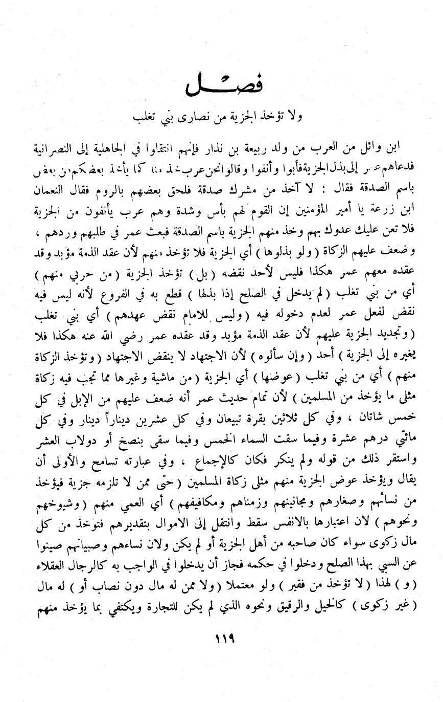 فَصْلٌ (وَلَا تُؤْخَذُ الْجِزْيَةُ مِنْ نَصَارَى بَنِي تَغْلِبَ) بْنِ وَائِلٍ مِنْ الْعَرَبِ مِنْ وَلَدِ رَبِيعَةَ بْنِ نَذَارٍ فَإِنَّهُمْ انْتَقَلُوا فِي الْجَاهِلِيَّةِ إلَى النَّصْرَانِيَّةِ فَدَعَاهُمْ عُمَرُ إلَى بَذْلِ الْجِزْيَةِ فَأَبَوْا وَأَنِفُوا وَقَالُوا نَحْنُ عَرَبٌ خُذْ مِنَّا كَمَا يَأْخُذُ بَعْضُكُمْ مِنْ بَعْضٍ بِاسْمِ الصَّدَقَةِ فَقَالَ: لَا آخُذُ مِنْ مُشْرِكٍ صَدَقَةً فَلَحِقَ بَعْضُهُمْ بِالرُّومِ فَقَالَ النُّعْمَانُ بْنُ زُرْعَةَ يَا أَمِيرَ الْمُؤْمِنِينَ إنَّ الْقَوْمَ لَهُمْ بَأْسٌ وَشِدَّةٌ وَهُمْ عَرَبٌ يَأْنَفُونَ مِنْ الْجِزْيَةِ فَلَا تُعِنْ عَلَيْكَ عَدُوَّكَ بِهِمْ وَخُذْ مِنْهُمْ الْجِزْيَةَ بِاسْمِ الصَّدَقَةِ فَبَعَثَ عُمَرُ فِي طَلَبِهِمْ وَرَدِّهِمْ، وَضَعَّفَ عَلَيْهِمْ الزَّكَاةَ.