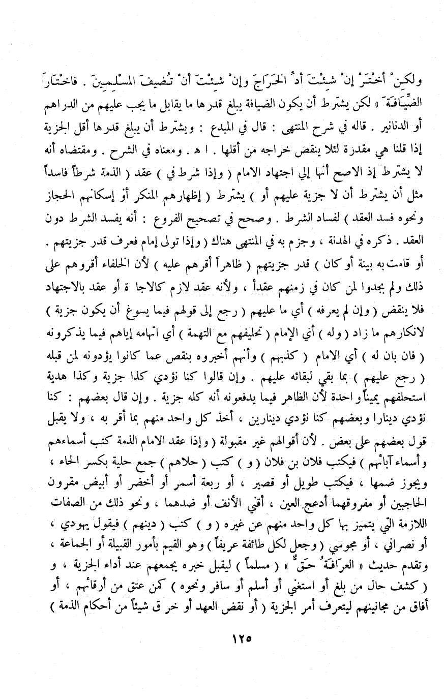 وَلَكِنْ اخْتَرْ إنْ شِئْتَ أَدِّ الْخَرَاجَ وَإِنْ شِئْتَ أَنْ تُضَيِّفَ الْمُسْلِمِينَ فَاخْتَارَ الضِّيَافَةَ " لَكِنْ يُشْتَرَطُ أَنْ تَكُونَ الضِّيَافَةُ يَبْلُغُ قَدْرُهَا مَا يُقَابِلُ مَا يَجِبُ عَلَيْهِمْ مِنْ الدَّرَاهِمِ أَوْ الدَّنَانِيرِ قَالَهُ فِي شَرْحِ الْمُنْتَهَى: قَالَ فِي الْمُبْدِعِ: وَيُشْتَرَطُ أَنْ يَبْلُغَ قَدْرُهَا أَقَلَّ الْجِزْيَةِ إذَا قُلْنَا هِيَ مُقَدَّرَةٌ لِئَلَّا يَنْقُصَ خَرَاجُهُ مِنْ أَقَلِّهَا اهـ وَمَعْنَاهُ فِي الشَّرْحِ وَمُقْتَضَاهُ أَنَّهُ لَا يُشْتَرَطُ إذْ الْأَصَحُّ أَنَّهَا إلَى اجْتِهَادِ الْإِمَامِ.