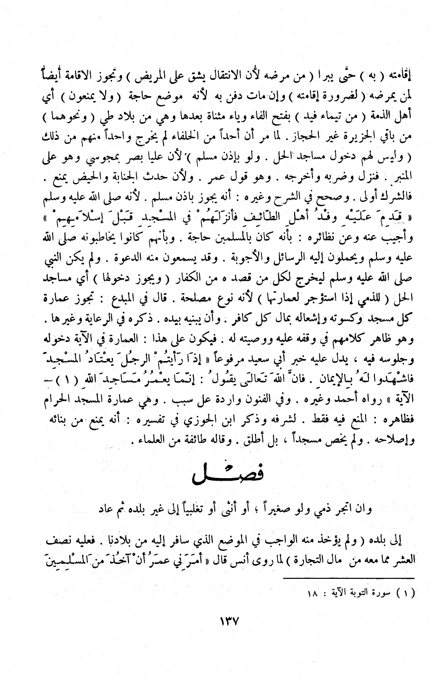 (وَلَيْسَ لَهُمْ دُخُولُ مَسَاجِدِ الْحِلِّ، وَلَوْ بِإِذْنِ مُسْلِمٍ) ؛ لِأَنَّ عَلِيًّا بَصَرَ بِمَجُوسِيٍّ وَهُوَ عَلَى الْمِنْبَرِ فَنَزَلَ وَضَرَبَهُ وَأَخْرَجَهُ، وَهُوَ قَوْلُ عُمَرَ وَلِأَنَّ حَدَثَ الْجَنَابَةِ وَالْحَيْضِ يَمْنَعُ فَالشِّرْكُ أَوْلَى، وَصَحَّحَ فِي الشَّرْحِ وَغَيْرِهِ أَنَّهُ يَجُوزُ بِإِذْنِ مُسْلِمٍ؛ لِأَنَّهُ - صَلَّى اللَّهُ عَلَيْهِ وَسَلَّمَ - «قَدِمَ عَلَيْهِ وَفْدُ أَهْلِ الطَّائِفِ فَأَنْزَلَهُمْ فِي الْمَسْجِدِ قَبْلَ إسْلَامِهِمْ» وَأُجِيبَ عَنْهُ وَعَنْ نَظَائِرِهِ: بِأَنَّهُ كَانَ بِالْمُسْلِمِينَ حَاجَةٌ وَبِأَنَّهُمْ كَانُوا يُخَاطِبُونَهُ - صَلَّى اللَّهُ عَلَيْهِ وَسَلَّمَ - وَيَحْمِلُونَ إلَيْهِ الرَّسَائِلَ وَالْأَجْوِبَةَ وَقَدْ يَسْمَعُونَ مِنْهُ الدَّعْوَةَ وَلَمْ يَكُنْ النَّبِيُّ - صَلَّى اللَّهُ عَلَيْهِ وَسَلَّمَ - لِيَخْرُجَ لِكُلِّ مَنْ قَصْدَهُ مِنْ الْكُفَّارِ (وَيَجُوزُ دُخُولُهَا) أَيْ: مَسَاجِدِ الْحِلِّ (لِلذِّمِّيِّ إذَا اُسْتُؤْجِرَ لِعِمَارَتِهَا) ؛ لِأَنَّهُ نَوْعُ مَصْلَحَةٍ قَالَ فِي الْمُبْدِعِ: تَجُوزُ عِمَارَةُ كُلِّ مَسْجِدٍ وَكِسْوَتُهُ وَإِشْعَالُهُ بِمَالِ كُلِّ كَافِرٍ، وَأَنْ يَبْنِيَهُ بِيَدِهِ ذَكَرَهُ فِي الرِّعَايَةِ وَغَيْرِهَا وَهُوَ ظَاهِرُ كَلَامِهِمْ فِي وَقْفِهِ عَلَيْهِ وَوَصِيَّتِهِ لَهُ فَيَكُونُ عَلَى هَذَا: الْعِمَارَةُ فِي الْآيَةِ دُخُولُهُ وَجُلُوسُهُ فِيهِ، يَدُلُّ عَلَيْهِ خَبَرُ أَبِي سَعِيدٍ مَرْفُوعًا «إذَا رَأَيْتُمْ الرَّجُلَ يَعْتَادُ الْمَسْجِدَ فَاشْهَدُوا لَهُ بِالْإِيمَانِ فَإِنَّ اللَّهَ تَعَالَى يَقُولُ {إِنَّمَا يَعْمُرُ مَسَاجِدَ اللَّهِ} [التوبة: ١٨] الْآيَةَ» رَوَاهُ أَحْمَدُ وَغَيْرُهُ.