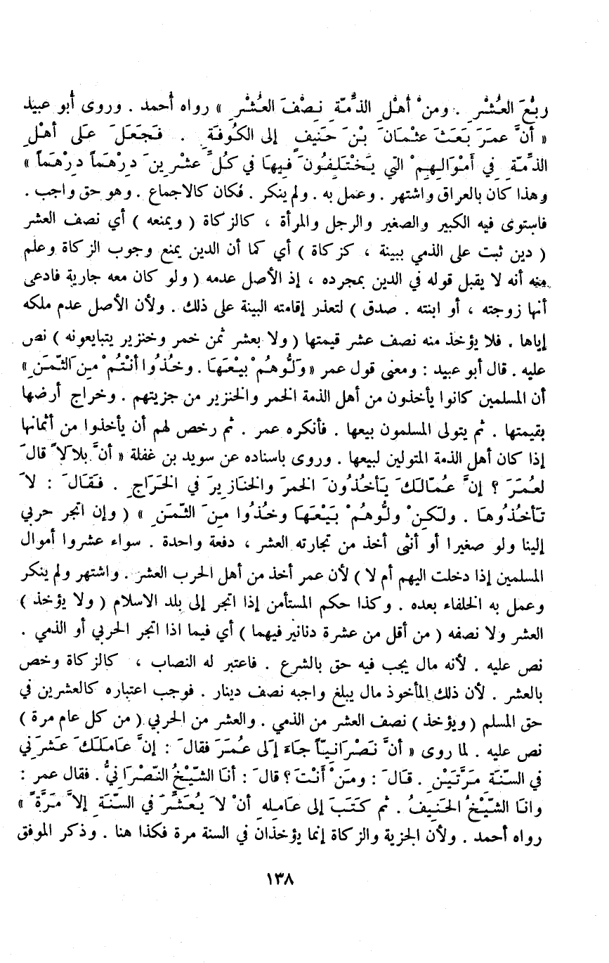 رُبُعَ الْعُشْرِ وَمِنْ أَهْلِ الذِّمَّةِ نِصْفَ الْعُشْرِ " رَوَاهُ أَحْمَدُ وَرَوَى أَبُو عُبَيْدٍ " أَنَّ عُمَرَ بَعَثَ عُثْمَانَ بْنَ حُنَيْفٍ إلَى الْكُوفَةِ فَجَعَلَ عَلَى أَهْلِ الذِّمَّةِ فِي أَمْوَالِهِمْ الَّتِي يَخْتَلِفُونَ فِيهَا فِي كُلِّ عِشْرِينَ دِرْهَمًا دِرْهَمًا " وَهَذَا كَانَ بِالْعِرَاقِ وَاشْتُهِرَ، وَعُمِلَ بِهِ، وَلَمْ يُنْكَرْ، فَكَانَ كَالْإِجْمَاعِ وَهُوَ حَقٌّ وَاجِبٌ فَاسْتَوَى فِيهِ الْكَبِيرُ وَالصَّغِيرُ وَالرَّجُلُ وَالْمَرْأَةُ، كَالزَّكَاةِ (وَيَمْنَعُهُ) أَيْ: نِصْفَ الْعُشْرِ (دَيْنٌ ثَبَتَ عَلَى الذِّمِّيِّ بِبَيِّنَةٍ كَزَكَاةٍ) أَيْ: كَمَا أَنَّ الدَّيْنَ يَمْنَعُ وُجُوبَ الزَّكَاةِ وَعُلِمَ مِنْهُ أَنَّهُ لَا يُقْبَلُ قَوْلُهُ فِي الدَّيْنِ بِمُجَرَّدِهِ، إذْ الْأَصْلُ عَدَمُهُ.