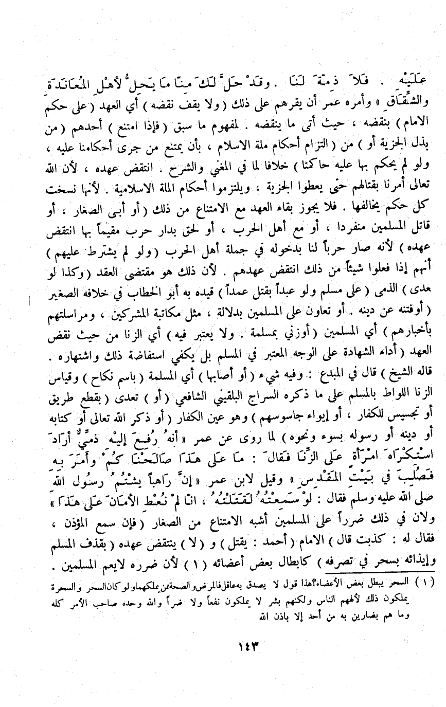 عَلَيْهِ فَلَا ذِمَّةَ لَنَا وَقَدْ حَلَّ لَك مِنَّا مَا يَحِلُّ لِأَهْلِ الْمُعَانَدَةِ وَالشِّقَاقِ " وَأَمَرَهُ عُمَرُ أَنْ يُقِرَّهُمْ عَلَى ذَلِكَ (وَلَا يَقِفُ نَقْضُهُ) أَيْ الْعَهْدِ (عَلَى حُكْمِ الْإِمَامِ) بِنَقْضِهِ، حَيْثُ أَتَى مَا يَنْقُضُهُ لِمَفْهُومِ مَا سَبَقَ.