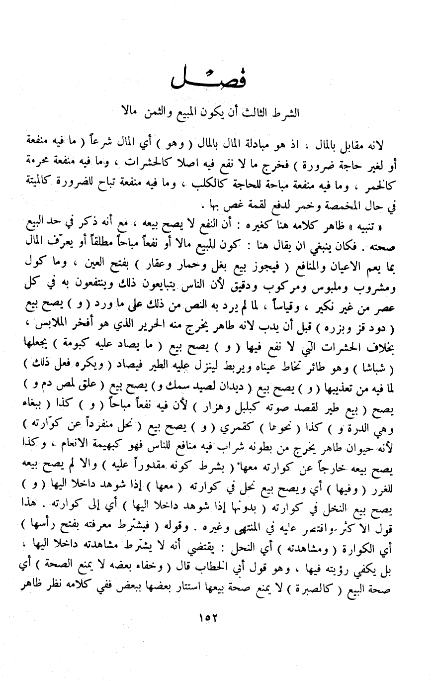 فَصْلٌ: الشَّرْطُ الثَّالِثُ أَنْ يَكُونَ الْمَبِيعُ وَالثَّمَنُ مَالًا لِأَنَّهُ مُقَابَلٌ بِالْمَالِ، إذْ هُوَ مُبَادَلَةُ الْمَالِ بِالْمَالِ (وَهُوَ) أَيْ: الْمَالُ شَرْعًا: (مَا فِيهِ مَنْفَعَةٌ أَوْ لِغَيْرِ حَاجَةٍ ضَرُورَةٍ) فَخَرَجَ مَا لَا نَفْعَ فِيهِ أَصْلًا كَالْحَشَرَاتِ وَمَا فِيهِ مَنْفَعَةٌ مُحَرَّمَةٌ كَالْخَمْرِ، وَمَا فِيهِ مَنْفَعَةٌ مُبَاحَةٌ لِلْحَاجَةِ كَالْكَلْبِ، وَمَا فِيهِ مَنْفَعَةٌ تُبَاحُ لِلضَّرُورَةِ كَالْمَيْتَةِ فِي حَالِ الْمَخْمَصَةِ وَخَمْرٍ لِدَفْعِ لُقْمَةٍ غَصَّ بِهَا " تَنْبِيهٌ " ظَاهِرُ كَلَامِهِ هُنَا كَغَيْرِهِ: أَنَّ النَّفْعَ لَا يَصِحُّ بَيْعُهُ مَعَ أَنَّهُ ذَكَرَ فِي حَدِّ الْبَيْعِ صِحَّتَهُ فَكَانَ يَنْبَغِي أَنْ يُقَالَ هُنَا: كَوْنُ الْمَبِيعِ مَالًا أَوْ نَفْعًا مُبَاحًا مُطْلَقًا أَوْ يُعَرَّفُ الْمَالُ بِمَا يَعُمُّ الْأَعْيَانَ وَالْمَنَافِعَ (فَيَجُوزُ بَيْعُ بَغْلٍ وَحِمَارٍ وَعَقَارٍ) بِفَتْحِ الْعَيْنِ، وَمَأْكُولٍ وَمَشْرُوبٍ وَمَلْبُوسٍ وَمَرْكُوبٍ وَدَقِيقٍ؛ لِأَنَّ النَّاسَ يَتَبَايَعُونَ ذَلِكَ وَيَنْتَفِعُونَ بِهِ فِي كُلِّ عَصْرٍ مِنْ غَيْرِ نَكِيرٍ، وَقِيَاسًا، لِمَا لَمْ يَرِدْ بِهِ النَّصُّ مِنْ ذَلِكَ عَلَى مَا وَرَدَ.