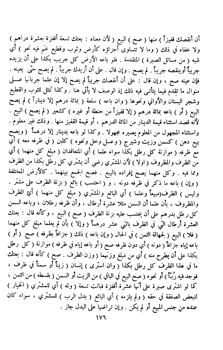 (وَإِنْ) بَاعَهُ مَا ذُكِرَ فِي ظَرْفِهِ دُونَهُ، وَ (احْتَسَبَ) بَائِعٌ (بِزِنَةِ الظَّرْفِ عَلَى مُشْتَرٍ وَلَيْسَ) الظَّرْفُ (مَبِيعًا وَعَلِمَا) أَيْ الْبَائِعُ وَالْمُشْتَرِي (مَبْلَغَ كُلِّ مِنْهُمَا) أَيْ الظَّرْفِ وَالْمَظْرُوفِ، بِأَنْ عَلِمَا أَنَّ السَّمْنَ مَثَلًا عَشْرَةُ أَرْطَالٍ، وَأَنَّ ظَرْفَهُ رِطْلَانِ، وَبَاعَهُ السَّمْنَ كُلَّ رِطْلٍ بِدِرْهَمٍ عَلَى أَنْ يَحْتَسِبَ عَلَيْهِ بِزِنَةِ الظَّرْفِ (صَحَّ) الْبَيْعُ، وَكَأَنَّهُ قَالَ بِعْتُكَ الْعَشَرَةَ أَرْطَالٍ الَّتِي فِي الظَّرْفِ بِاثْنَيْ عَشَرَ دِرْهَمًا (وَإِلَّا) بِأَنْ لَمْ يَعْلَمَا مَبْلَغَ كُلٍّ مِنْهُمَا (فَلَا) يَصِحُّ الْبَيْعُ (لِجَهَالَةِ الثَّمَنِ) فِي الْحَالِ.