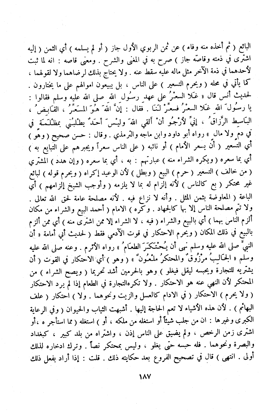 (وَيَحْرُمُ التَّسْعِيرُ) عَلَى النَّاسِ بَلْ يَبِيعُونَ أَمْوَالَهُمْ عَلَى مَا يَخْتَارُونَ لِحَدِيثِ أَنَسٍ قَالَ «غَلَا السِّعْرُ عَلَى عَهْدِ رَسُولِ اللَّهِ - صَلَّى اللَّهُ عَلَيْهِ وَسَلَّمَ - فَقَالُوا يَا رَسُولَ اللَّهِ غَلَا السِّعْرُ فَسَعِّرْ لَنَا فَقَالَ: إنَّ اللَّهَ هُوَ الْمُسَعِّرُ، الْقَابِضُ، الْبَاسِطُ الرَّزَّاقُ، إنِّي لَأَرْجُوَ أَنْ أَلْقَى اللَّهَ وَلَيْسَ أَحَدٌ يَطْلُبنِي بِمَظْلِمَةٍ فِي دَمٍ وَلَا مَالٍ» رَوَاهُ أَبُو دَاوُدَ وَابْنُ مَاجَهْ وَالتِّرْمِذِيُّ وَقَالَ حَسَنٌ صَحِيحٌ (وَهُوَ) أَيْ التَّسْعِيرُ (أَنْ يُسَعِّرَ الْإِمَامُ) أَوْ نَائِبُهُ (عَلَى النَّاسِ سِعْرًا وَيَجْبُرَهُمْ عَلَى التَّبَايُعِ بِهِ) أَيْ بِمَا سَعَّرَهُ.