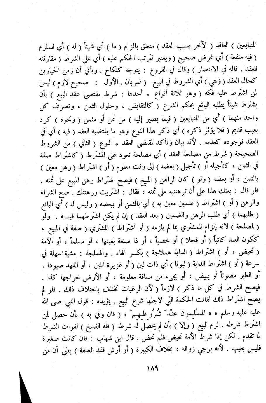 (وَيُعْتَبَرُ لِتَرَتُّبِ الْحُكْمِ عَلَيْهِ) أَيْ عَلَى الشَّرْطِ (مُقَارَنَتُهُ لِلْعَقْدِ قَالَهُ فِي الِانْتِصَارِ) وَقَالَ فِي الْفُرُوعِ: يَتَوَجَّهُ كَنِكَاحٍ وَيَأْتِي أَنَّ زَمَنَ الْخِيَارَيْنِ كَحَالِ الْعَقْدِ (وَهِيَ) أَيْ الشُّرُوطُ فِي الْبَيْعِ (ضَرْبَانِ) الْأَوَّلُ: صَحِيحٌ لَازِمٌ لَيْسَ لِمَنْ اشْتَرَطَ عَلَيْهِ فَكَّهُ (وَهُوَ ثَلَاثَةُ أَنْوَاعٍ أَحَدُهَا: شَرْطٌ مُقْتَضِي عَقْدَ الْبَيْعِ) بِأَنْ يَشْتَرِطَ شَيْئًا يَطْلُبُهُ الْبَائِعُ بِحُكْمِ الشَّرْعِ (كَالتَّقَابُضِ، وَحُلُولِ الثَّمَنِ، وَتَصَرُّفِ كُلِّ وَاحِدٍ مِنْهُمَا) أَيْ مِنْ الْمُتَبَايِعَيْنِ (فِيمَا يَصِيرُ إلَيْهِ) مِنْ ثَمَنٍ أَوْ مُثَمَّنٍ.