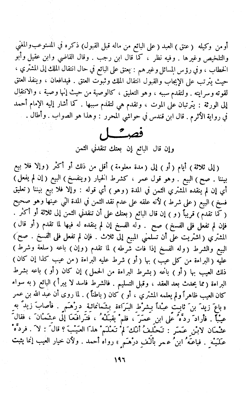 (وَإِنْ) بَاعَهُ (سِلْعَةً وَشَرَطَ) عَلَيْهِ (الْبَرَاءَةَ مِنْ كُلِّ عَيْبٍ) بِهَا (أَوْ) شَرَطَ عَلَيْهِ الْبَرَاءَةَ (مِنْ عَيْبِ كَذَا إنْ كَانَ) ذَلِكَ الْعَيْبُ بِهَا (أَوْ) بَاعَهُ (بِشَرْطِ الْبَرَاءَةِ مِنْ الْحَمْلِ) إنْ كَانَ (أَوْ) بَاعَهُ بِشَرْطِ الْبَرَاءَةِ (مِمَّا يَحْدُثُ بَعْدَ الْعَقْدِ، وَقَبْلَ التَّسْلِيمِ فَالشَّرْطُ فَاسِدٌ لَا يَبْرَأُ) الْبَائِعُ (بِهِ سَوَاءٌ كَانَ الْعَيْبُ ظَاهِرًا وَلَمْ يَعْلَمْهُ الْمُشْتَرِي، أَوْ) كَانَ (بَاطِنًا) لِمَا رُوِيَ أَنَّ عَبْدَ اللَّهِ بْنَ عُمَرَ " بَاعَ زَيْدَ بْنَ ثَابِتٍ عَبْدًا بِشَرْطِ الْبَرَاءَةِ بِثَمَانِمِائَةِ دِرْهَمٍ فَأَصَابَ زَيْدٌ بِهِ عَيْبًا فَأَرَادَ رَدَّهُ عَلَى ابْنِ عُمَرَ فَلَمْ يَقْبَلْهُ، فَتَرَافَعَا إلَى عُثْمَانَ فَقَالَ عُثْمَانُ لِابْنِ عُمَرَ: تَحْلِفُ أَنَّكِ لَمْ تَعْلَمْ هَذَا الْعَيْبَ؟ قَالَ لَا فَرَدَّهُ عَلَيْهِ فَبَاعَهُ ابْنُ عُمَرَ بِأَلْفِ دِرْهَمٍ رَوَاهُ أَحْمَدُ وَلِأَنَّ خِيَارَ الْعَيْبِ إنَّمَا يَثْبُتُ