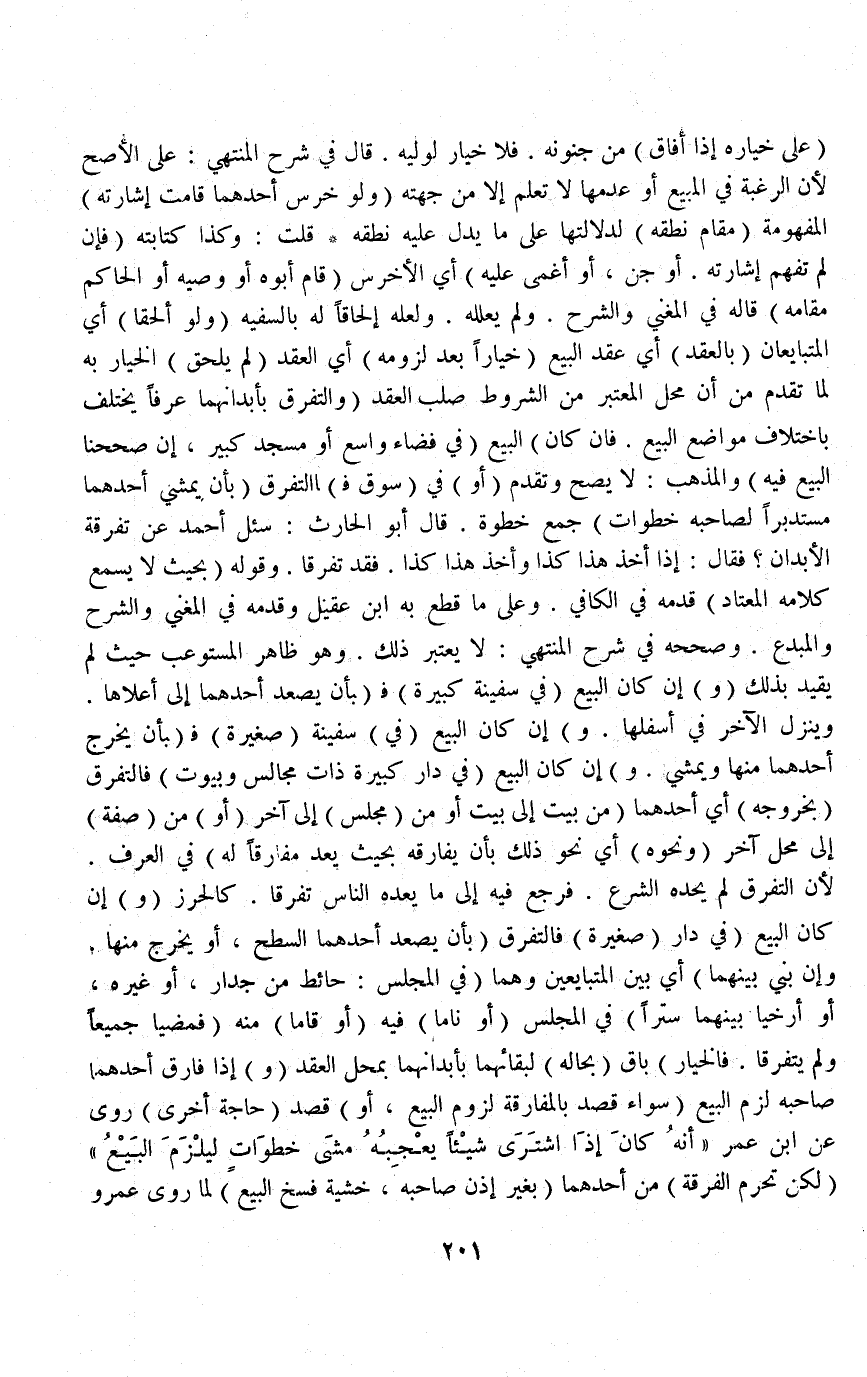 (وَ) إنْ كَانَ الْبَيْعُ (فِي سَفِينَةٍ كَبِيرَةٍ) فَ (بِأَنْ يَصْعَدَ أَحَدُهُمَا إلَى أَعْلَاهَا وَيَنْزِلَ الْآخَرُ فِي أَسْفَلِهَا وَ) إنْ كَانَ الْبَيْعُ (فِي) سَفِينَةٍ (صَغِيرَةٍ) فَ (بِأَنْ يَخْرُجَ أَحَدُهُمَا مِنْهَا وَيَمْشِي وَ) إنْ كَانَ الْبَيْعُ (فِي دَارٍ كَبِيرَةٍ ذَاتِ مَجَالِسَ وَبُيُوتٍ) فَالتَّفَرُّقُ (بِخُرُوجِهِ) أَيْ أَحَدِهِمَا (مِنْ بَيْتٍ إلَى بَيْتٍ أَوْ مِنْ مَجْلِسٍ إلَى آخَرَ) (أَوْ) مِنْ (صِفَةٍ) إلَى مَحَلٍّ آخَرَ (وَنَحْوِهِ) (أَيْ نَحْوِ ذَلِكَ بِأَنْ يُفَارِقَهُ بِحَيْثُ يُعَدُّ مُفَارِقًا لَهُ) فِي الْعُرْفِ لِأَنَّ التَّفَرُّقَ لَمْ يَحُدُّهُ الشَّرْعُ فَرَجَعَ فِيهِ إلَى مَا يَعُدُّهُ النَّاسُ تَفَرُّقًا كَالْحِرْزِ.