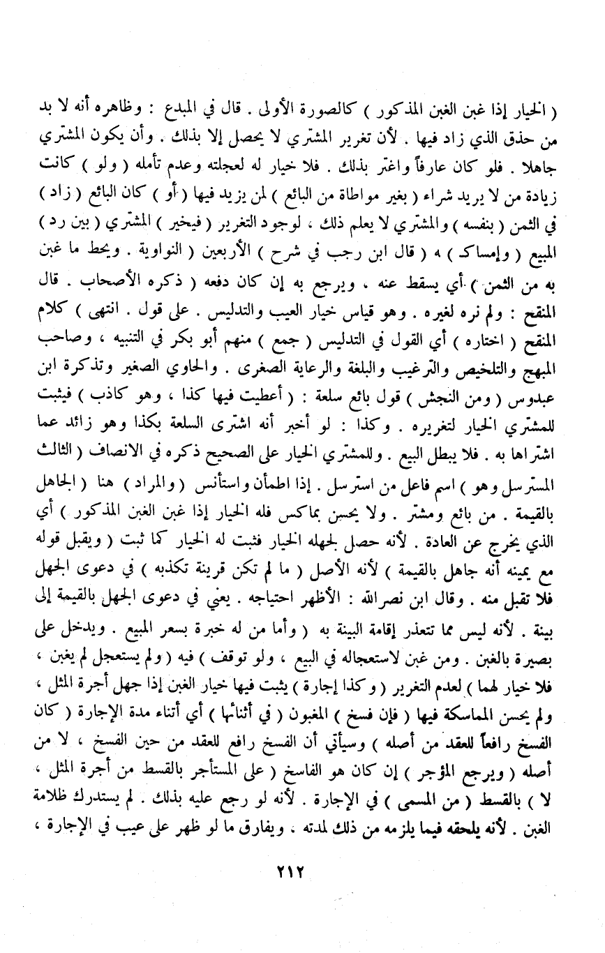 (قَالَ ابْنُ رَجَبٍ فِي شَرْحِ) الْأَرْبَعِينَ (النَّوَوِيَّةِ: وَيُحَطُّ مَا غُبِنَ بِهِ مِنْ الثَّمَنِ) أَيْ يَسْقُطُ عَنْهُ وَيَرْجِعُ بِهِ إنْ كَانَ دَفَعَهُ (ذَكَرَهُ الْأَصْحَابُ قَالَ الْمُنَقِّحَ: وَلَمْ نَرَهُ لِغَيْرِهِ وَهُوَ قِيَاسُ خِيَارِ الْعَيْبِ وَالتَّدْلِيسِ عَلَى قَوْلٍ انْتَهَى) كَلَامُ الْمُنَقِّحِ (اخْتَارَهُ) أَيْ الْقَوْلَ فِي التَّدْلِيسِ (جَمْعٌ) مِنْهُمْ أَبُو بَكْرٍ فِي التَّنْبِيهِ، وَصَاحِبُ الْمُبْهِجِ وَالتَّلْخِيصِ وَالتَّرْغِيبِ وَالْبُلْغَةِ وَالرِّعَايَةِ الصُّغْرَى وَالْحَاوِي الصَّغِيرِ وَتَذْكِرَةِ ابْنِ عَبْدُوسٍ (وَمِنْ النَّجْشِ) قَوْلُ بَائِعٍ سِلْعَةٍ (أُعْطِيتُ فِيهَا كَذَا، وَهُوَ كَاذِبٌ) فَيَثْبُتُ لِلْمُشْتَرِي الْخِيَارُ لِتَغْرِيرِهِ وَكَذَا: لَوْ أَخْبَرَ أَنَّهُ اشْتَرَى السِّلْعَةَ بِكَذَا وَهُوَ زَائِدٌ عَمَّا اشْتَرَاهَا بِهِ فَلَا يَبْطُلُ الْبَيْعُ وَلِلْمُشْتَرِي الْخِيَارُ عَلَى الصَّحِيحِ ذَكَرَهُ فِي الْإِنْصَافِ.