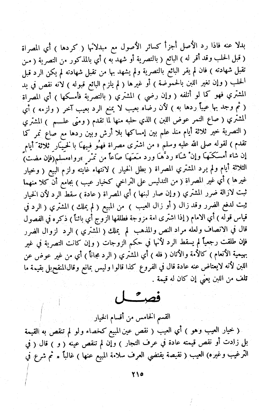 فَصْلٌ الْقِسْمُ الْخَامِسُ مِنْ أَقْسَامِ الْخِيَارِ (خِيَارُ الْعَيْبِ وَهُوَ) أَيْ الْعَيْبُ (نَقْصُ عَيْنِ الْمَبِيعِ كَخِصَاءٍ وَلَوْ لَمْ تَنْقُصْ بِهِ الْقِيمَةُ بَلْ زَادَتْ أَوْ نَقْصِ قِيمَتِهِ عَادَةً فِي عُرْفِ التُّجَّارِ) وَإِنْ لَمْ تَنْقُصْ عَيْنُهُ.