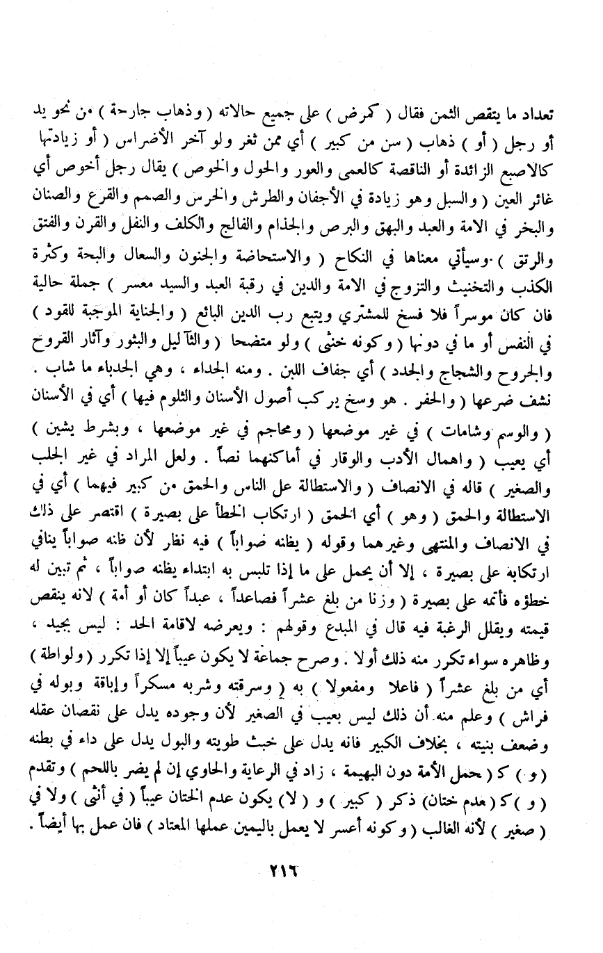 تَعْدَادِ مَا يُنْقِصُ الثَّمَنَ فَقَالَ (كَمَرَضٍ) عَلَى جَمِيعِ حَالَاتِهِ (وَذَهَابِ جَارِحَةٍ) مِنْ نَحْوِ يَدٍ أَوْ رِجْلٍ (أَوْ) ذَهَابِ (سِنٍّ مِنْ كَبِيرٍ) أَيْ مِنْ ثَغْرٍ وَلَوْ آخِرِ الْأَضْرَاسِ (أَوْ زِيَادَتِهَا كَالْأُصْبُعِ الزَّائِدَةِ أَوْ النَّاقِصَةِ كَالْعَمَى وَالْعَوَرِ وَالْحَوَلِ وَالْخَوَصِ) يُقَالُ رَجُلٌ أَخَوْصُ أَيْ غَائِرُ الْعَيْنِ.